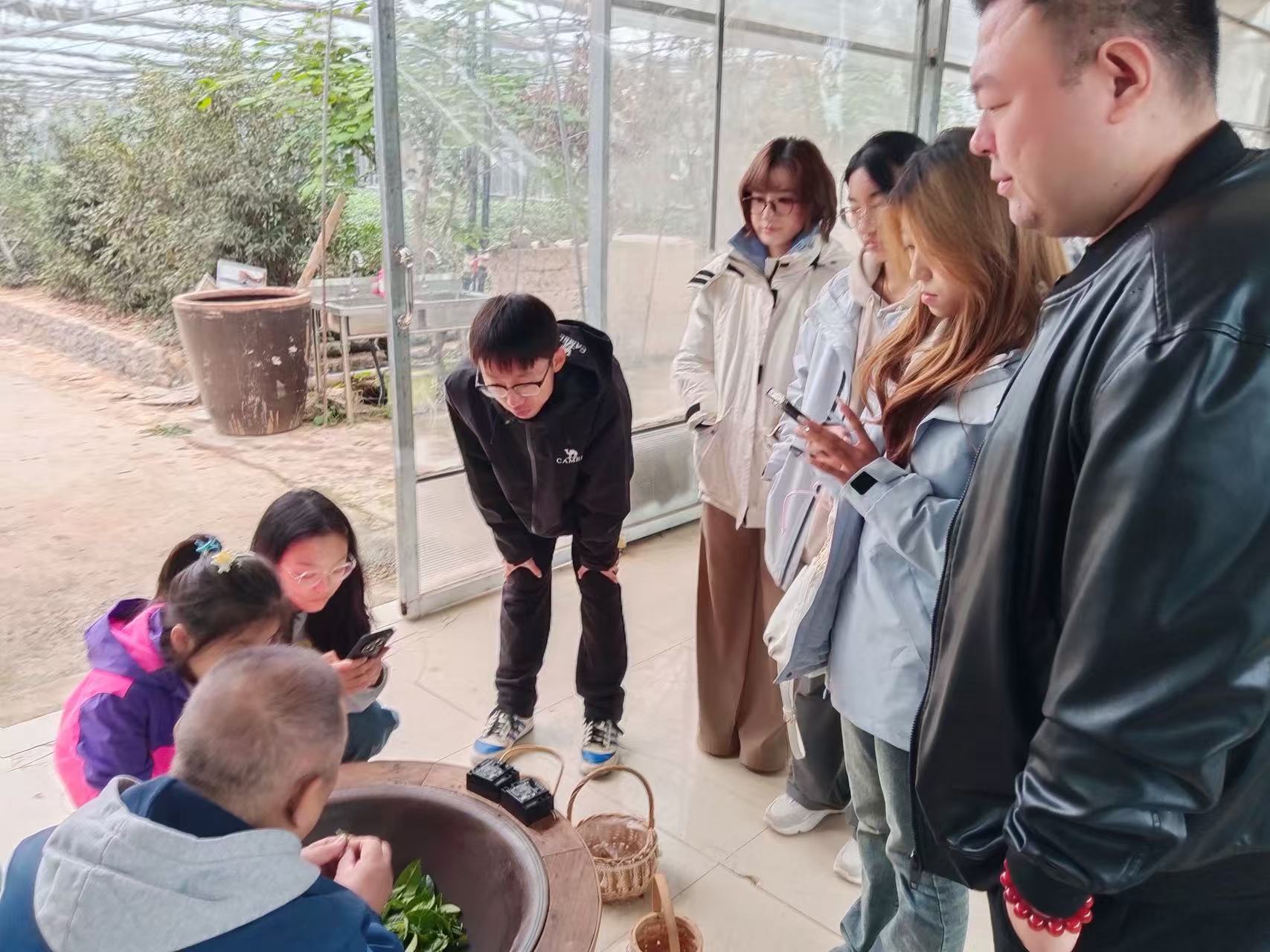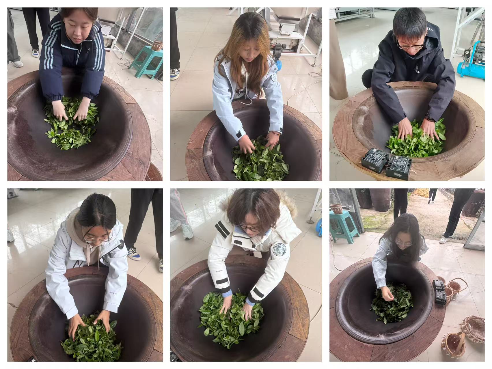 一番忙碌的采摘后,学生们的竹篓里已沉甸甸装满了鲜嫩的茶叶。望着这亲手收获的劳动果实,每个人脸上都漾着满满的自豪与喜悦。随后,大家走进茶园的制茶工坊,近距离见证了鲜叶蜕变为成品茶的奇妙历程。杀青时的热气蒸腾、揉捻时的力道掌控、干燥时的耐心等候,每一道工序都凝结着精湛技艺与岁月沉淀的经验。学生们纷纷围在刘总身旁,专注观摩学习,还踊跃参与了部分制作环节,在亲手实践中深深领略到传统制茶工艺的独特魅力。