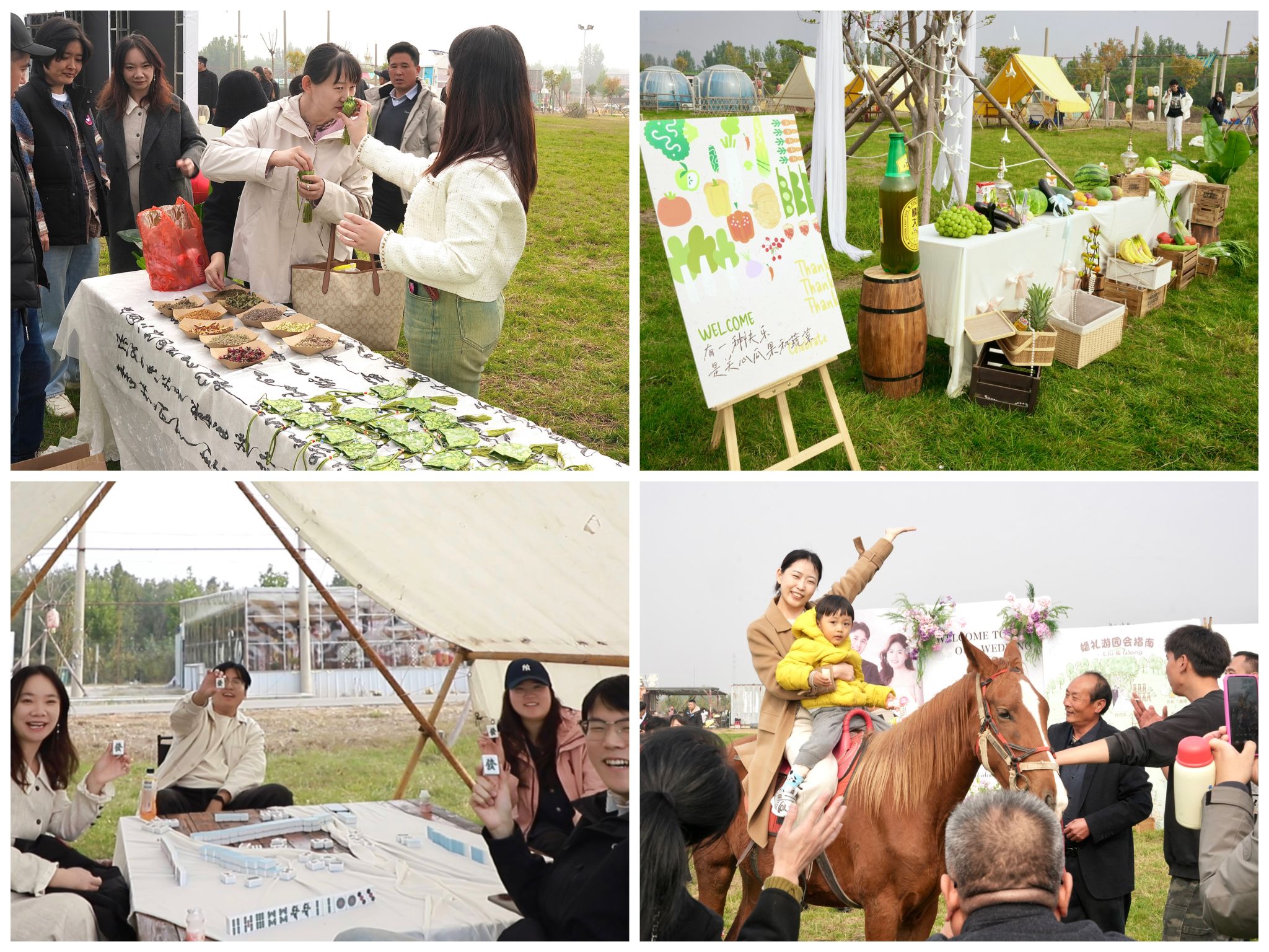 同学们将大学四年在各类活动中积累的创意与组织能力,悄然融入游园会每个环节里:婚礼恰逢重阳节前夕,那就准备些茱萸、桂花,设置DIY香囊活动,让传统的韵味为婚礼添上一份雅致;有同学提议提出增设“麻将休闲区”和“幸运刮刮乐”,让婚礼少些拘谨、多些亲友围坐的烟火气和欢笑声;再搭配“瓜果打包站”,让宾客有互动感和参与感,还能带走一份可食用的甜蜜礼物;还有在新娘骑马出场的基础上为大家争取到骑马游园的惊喜环节,让草坪婚礼多了份独特的仪式感。
