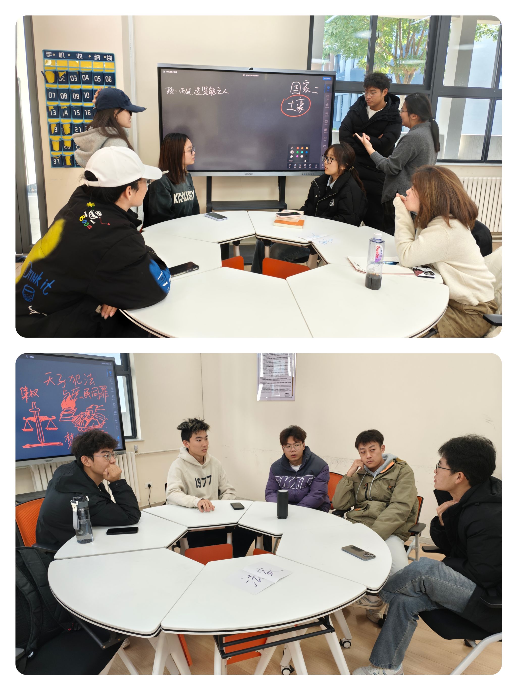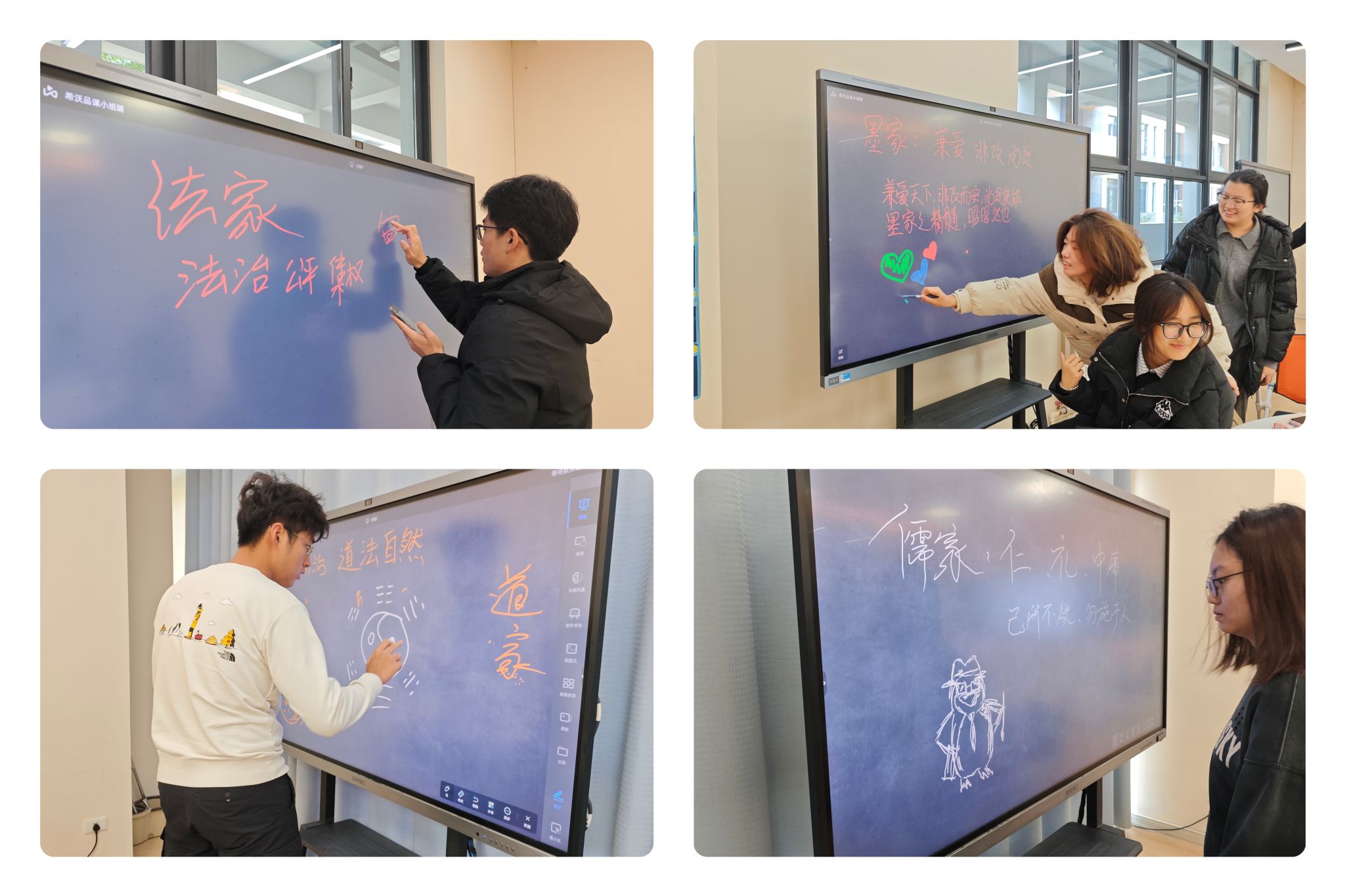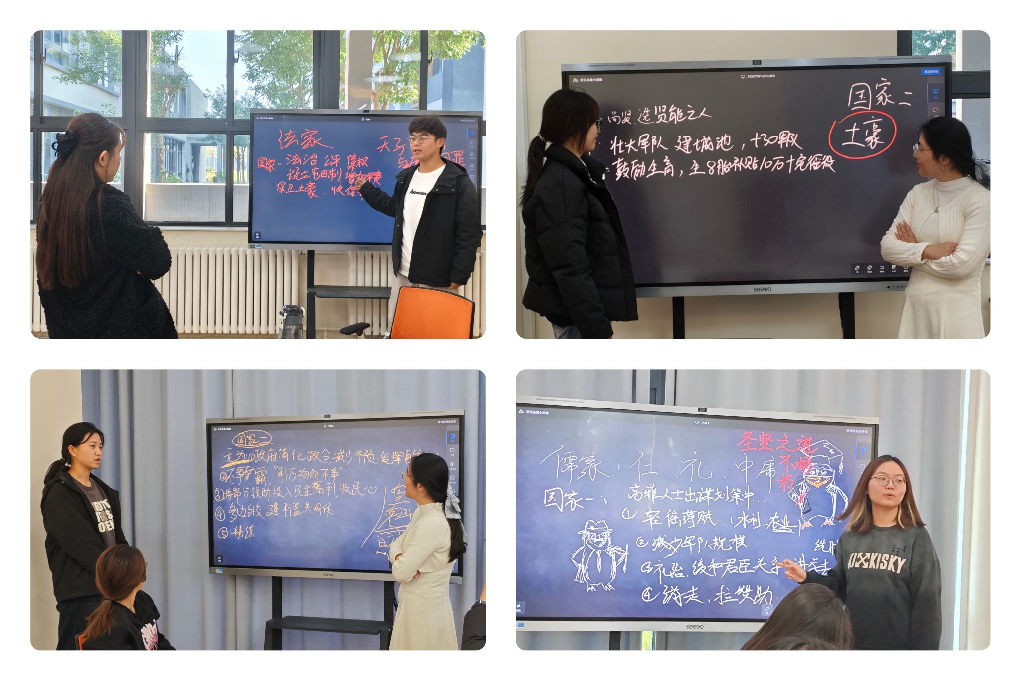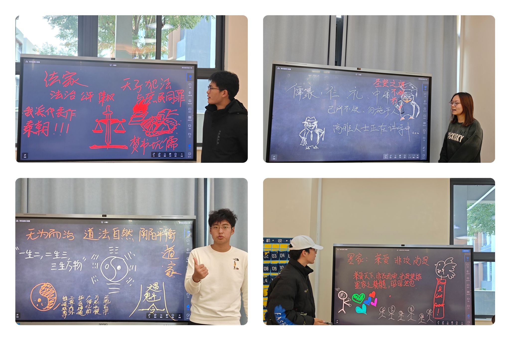 通过“学派立场声明·我是谁”环节,同学们完成了一场与先贤的深度对话。各小组化身儒、道、墨、法四家代表,在两位老师的引导下,凝练学派核心主张、择取传世“金句”并创作思想符号迅速把握了各派思想精髓。一时间,“仁者爱人”“道法自然”“兼爱非攻”“以法治国”等思想精髓跃然于黑板之上。