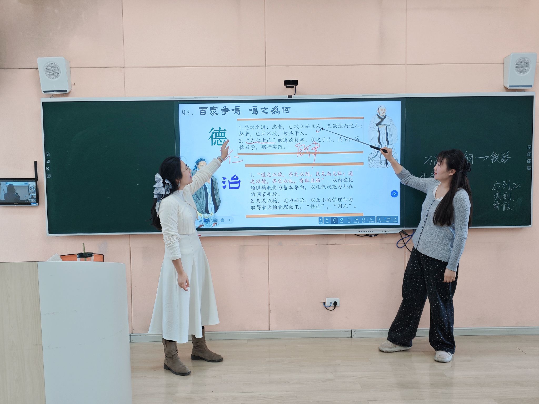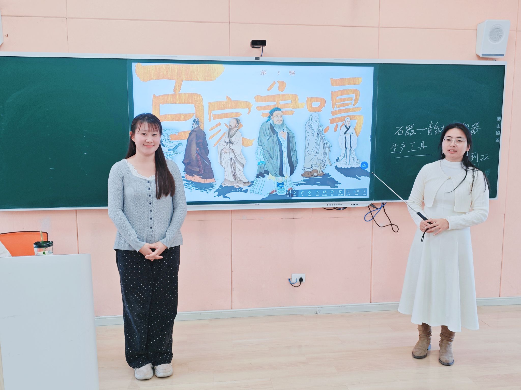 为助力同学们深入理解诸子百家的思想与智慧,讨论哲学议题,孙乐老师和周萌老师合作,围绕“百家争鸣”这一主题,引导学生回到春秋战国时期,在历史情境的再现与哲学思辨的交融里,进行了一场超越千年的交流,深切领悟了中华思想文化的发展源泉。