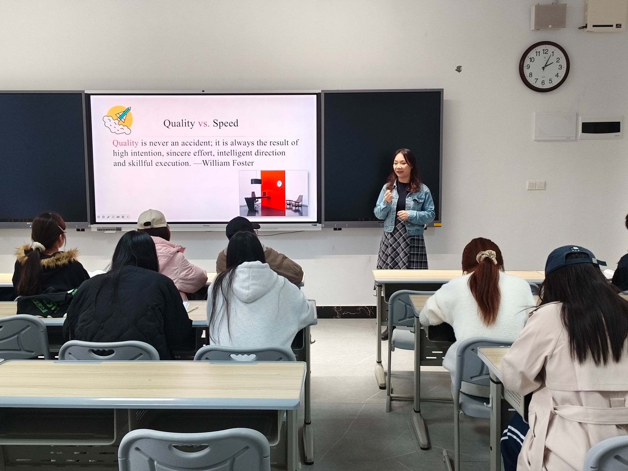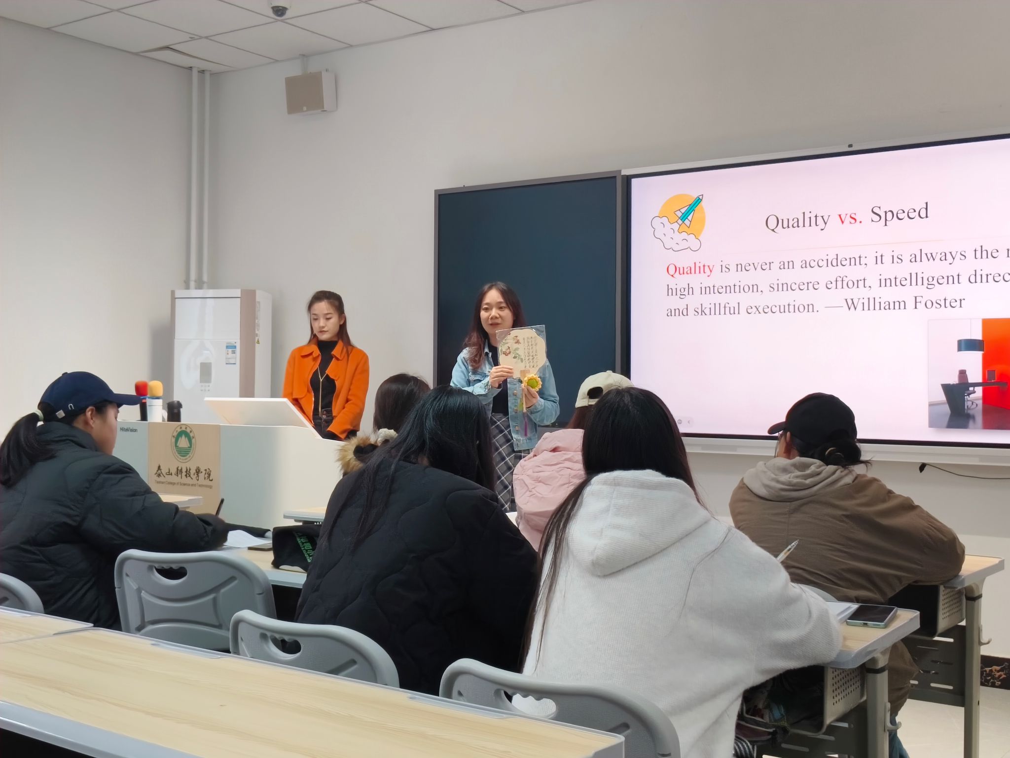 10月30日的大学英语课堂以一组看似平常的物品开启:一把手写的书法团扇、一个用棉线编织的挂件、一只一次性纸杯,以及一副塑料手套。前两者纯手工制作,体现对细节的专注与文化情感的投入;后两者则是工业化快消品的代表,强调效率、成本与可替代性。大学英语杨美丽老师与战略管理李文玉老师以这组对比作为引入,引导学生在《The Joy of a Prideful Tradition》一文中思考:当“快”成为默认选项,那些需要时间、耐心与心意的“慢”是否还有价值?工作的快乐,究竟来自产出的速度,还是投入的深度?由此,同学们共同开启了一场关于“工作快乐从何而来”的跨学科对话。