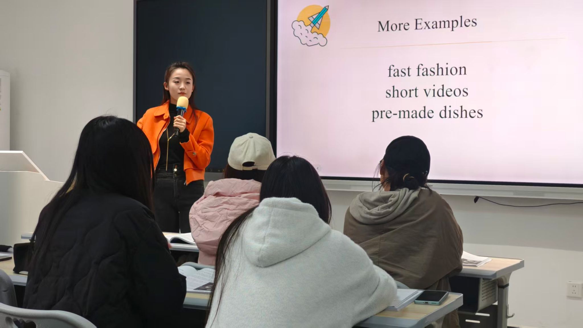 同时,李文玉老师将讨论从文本引向现实社会语境。她向学生展示了三个关键词:“pre-made dishes(预制菜)”“fast fashion(快时尚)”“short videos(短视频)”,并追问:“这些产品或内容的共同逻辑是什么?”学生迅速答出:“快、便宜、可复制。”李老师接着引入“效率至上”文化对职业尊严的潜在侵蚀:当工作被拆解为可计量的任务单元,劳动者就容易沦为流程中的“执行端口”,失去对整体意义的感知。她还帮助学生区分“敬业”与“服从”——前者包含主体性,后者则可能导向“burnout(职业倦怠)”。