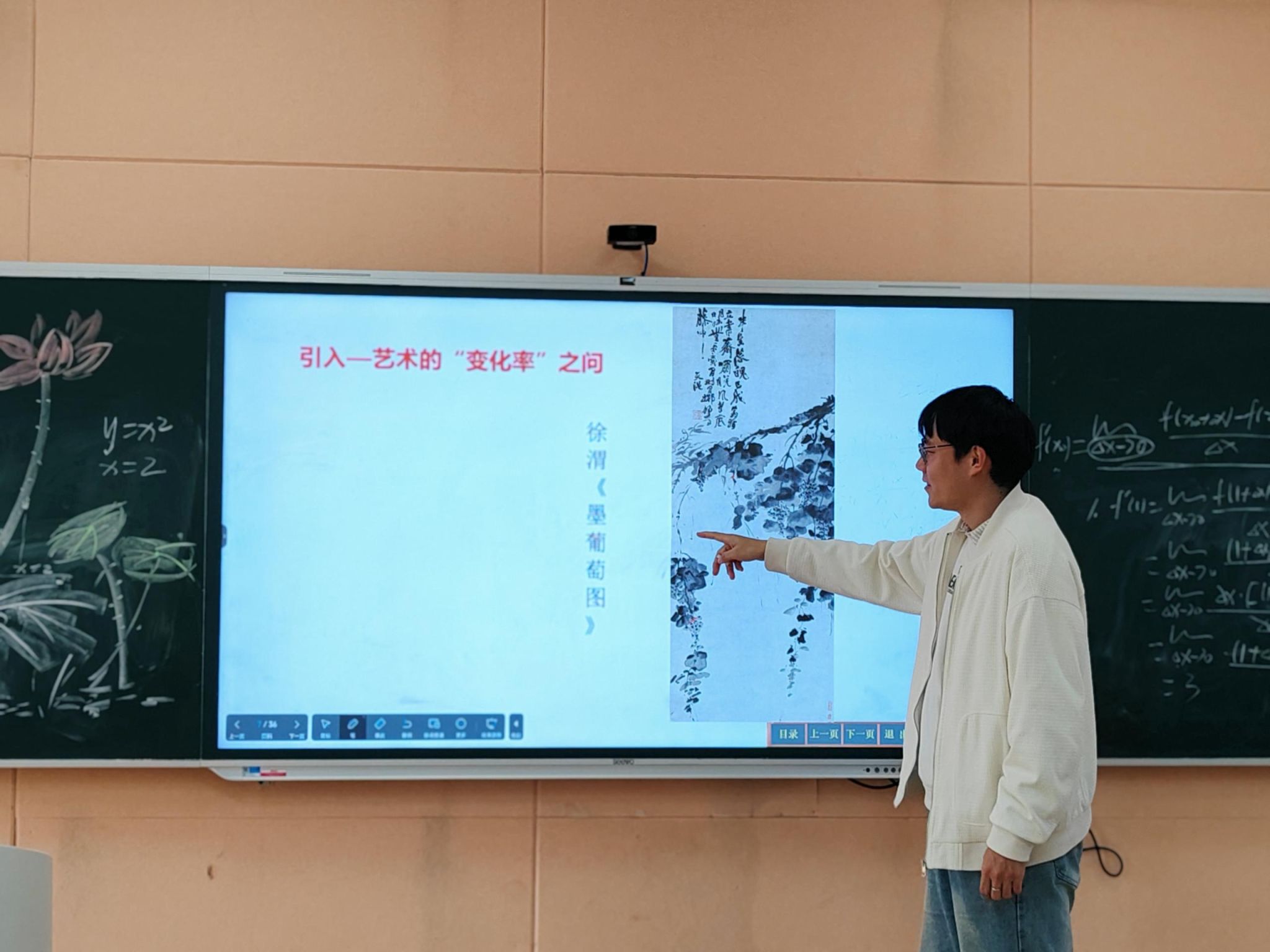 艺术给了我们“变化”的直觉,数学则要给出“变化”的刻度,张老师从经典的瞬时速度问题与切线斜率问题入手,严谨而清晰地引出了导数的定义。紧接着,课堂氛围在一互动环节中达到高潮——张老师展示了刘老师在课上即兴绘制的一幅荷花图,图中一支荷梗弯曲而上,托起盛放的莲花。她挑战学生们:“能否用一个函数来近似描述这支荷梗优雅的弧度?”问题一出,教室里顿时思绪飞扬,有人脱口而出“二次函数”,也有人猜测“幂函数”。在热烈的猜想与探讨中,张老师引导大家最终选定了一个近似函数,并现场计算了其在 x=1处的导数,将抽象数学概念与具象艺术形态瞬间连接。