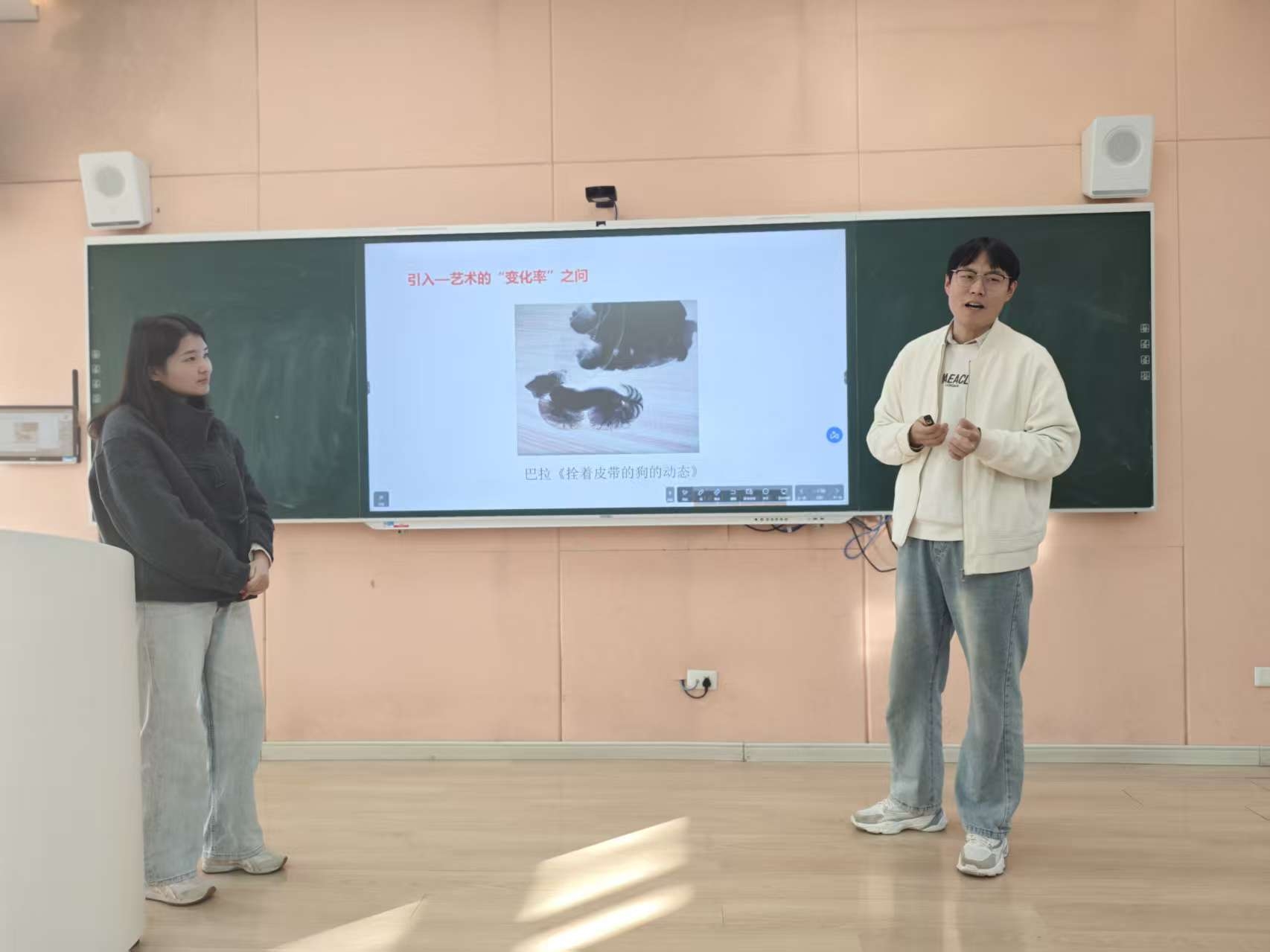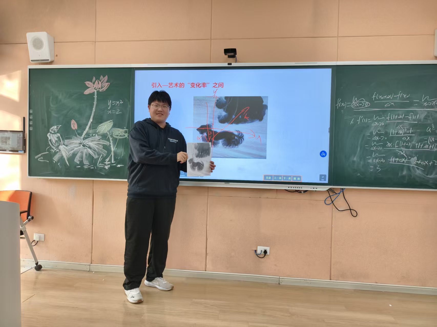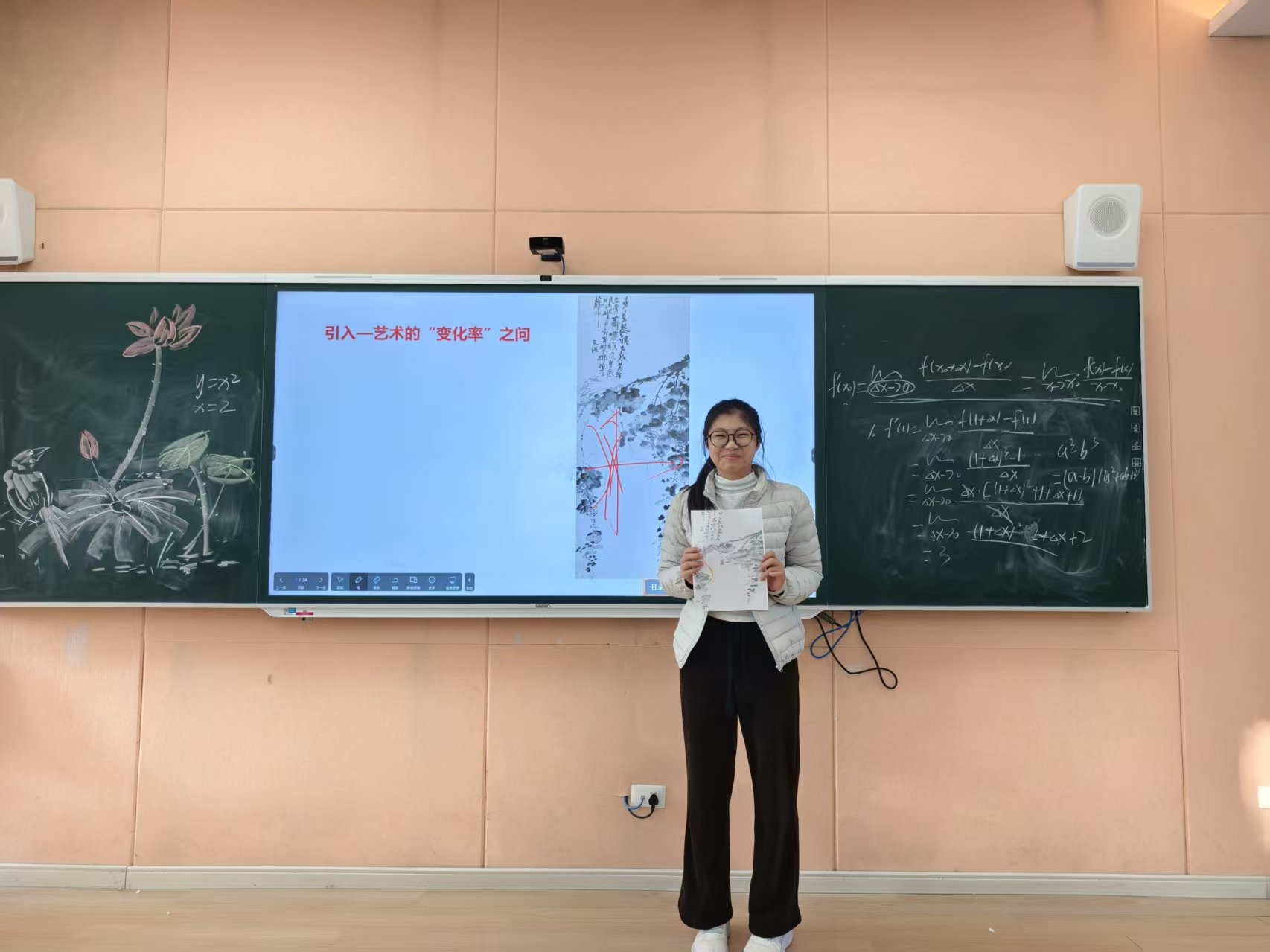 11月4日,数学老师张敏敏与美术老师刘炎在新言书院113进行了跨学科双师授课,以“导数”这一高等数学核心概念为轴心,串联起艺术世界中流动的形态与变化的瞬间,展开了一场理性思维与感性审美交融的探索之旅。这打破了传统的课堂形式,同时培养了学生用数学的眼光观察艺术,用艺术的感性理解数学的跨学科思维。