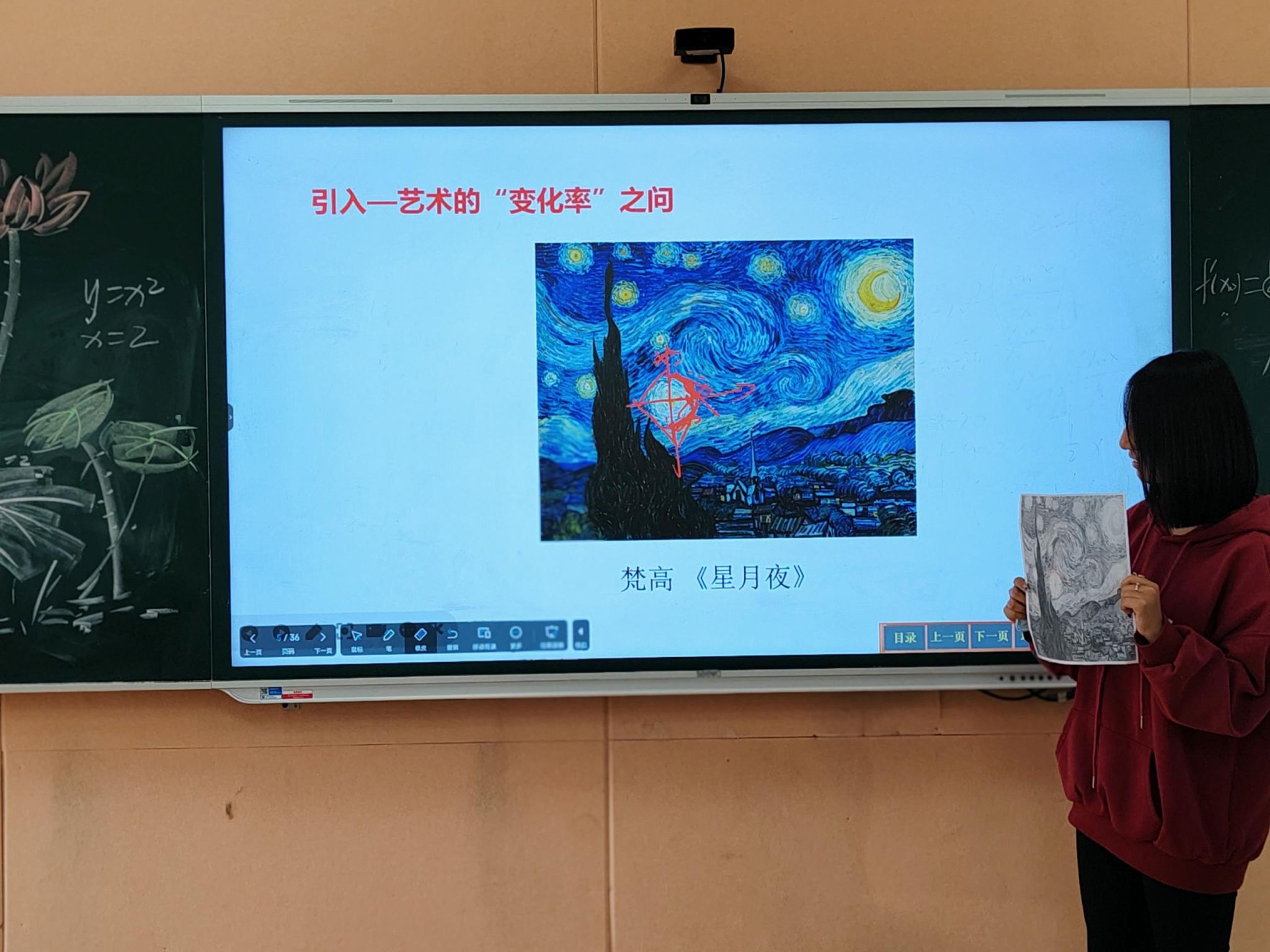 经过一番思想的碰撞与探索,各小组代表轮番上台分享见解。他们分析道,《星月夜》的涡旋结构暗示着正值的导数,给人以“越转越快”的视觉心理效应;小狗腿部的虚影序列,恰恰反映了位移对时间的导数(即速度)其绝对值呈现出“先增大后减小”的规律;而徐渭笔下的葡萄藤实则暗合了函数曲线上变化率剧烈的区间,赋予了静态画面以强烈的动态张力。
