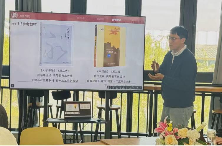 刘炎老师结合远景学院学生特点与学校美育体系,对《中国书画艺术鉴赏与创意表达》课程进行了说课,重点介绍了课程内容安排、教学方法及评价机制。潘教授指出,通识课程应注重体验性与实践性,建议进一步优化课程内容的逻辑层次,强化课程内容与项目化活动之间的衔接,以增强学生的综合艺术素养与表达力。
