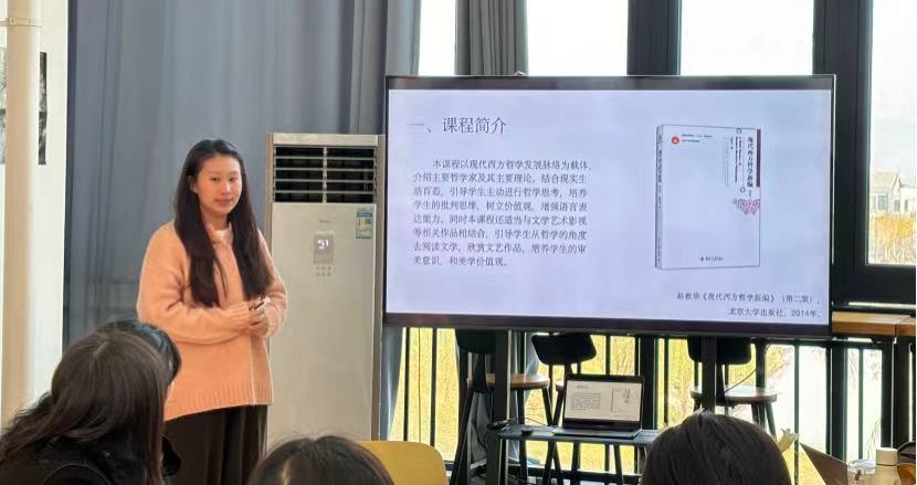 在课程汇报环节,哲学教师周萌就《现代西方哲学概览》进行了系统说课,从课程定位、教学目标到教学方法逐一阐释。课程融合经典文本阅读与影视作品解析,并设计了特色游戏环节,以启发式、互动式教学激发学生兴趣。潘迎春教授肯定了该课程教学手段的多样性,同时建议适当精简专业理论内容,加强课程内容与学生现实生活及社会文化议题的横向联系,使哲学思考更贴近学生认知实际。