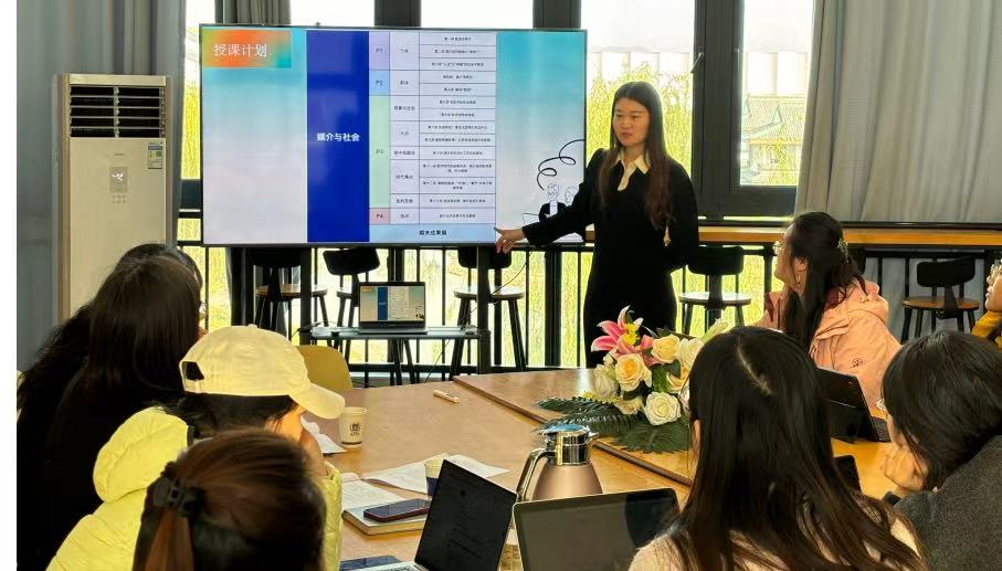 李子一与王豆豆老师共同展示了双师课程《媒介与社会》的教学设计与实施思路。该课程创新采用“双师协同”教学模式,注重在跨学科碰撞中拓展学生视野,并重点培养学生的表达与写作能力。课程将论文写作指导贯穿全程,强调“在学中练、在练中悟”,帮助学生在实践过程中深化理论认知,提升综合素养。潘迎春教授充分肯定了双师模式在丰富教学视角方面的积极作用,同时建议进一步优化学科融合机制,强化写作训练与理论教学的衔接,确保在有限学时内实现教学效果最优化,真正体现“以学生发展为中心”的教学理念。