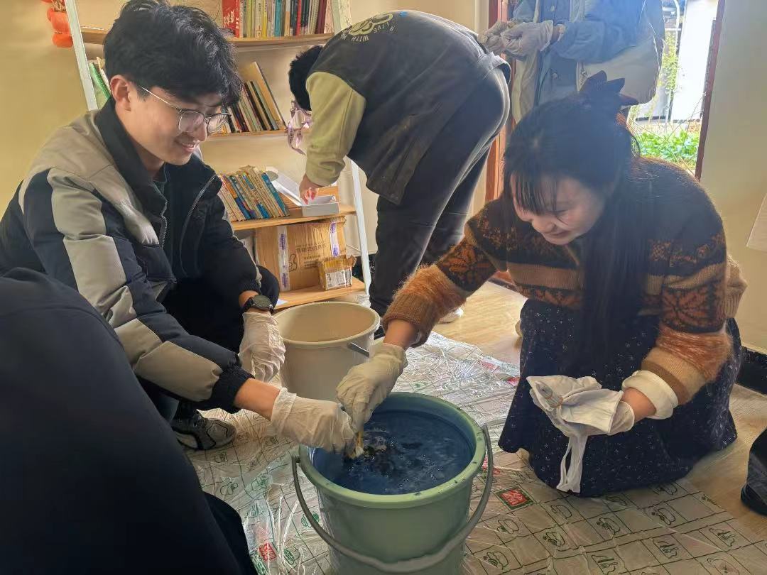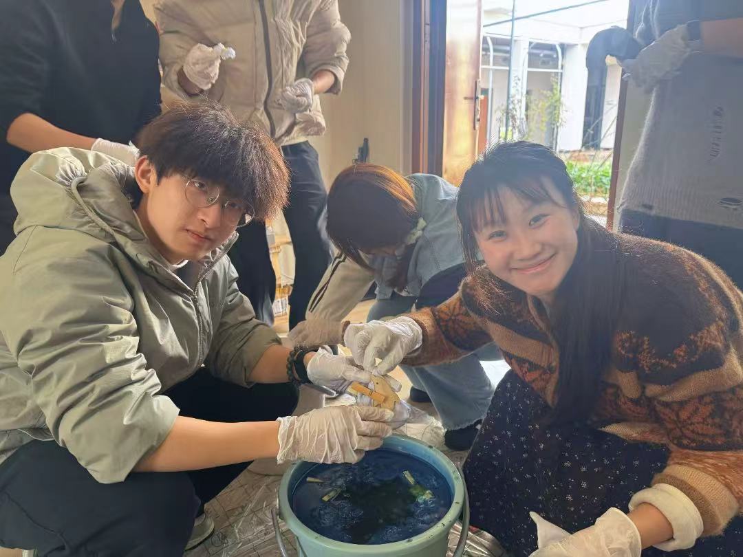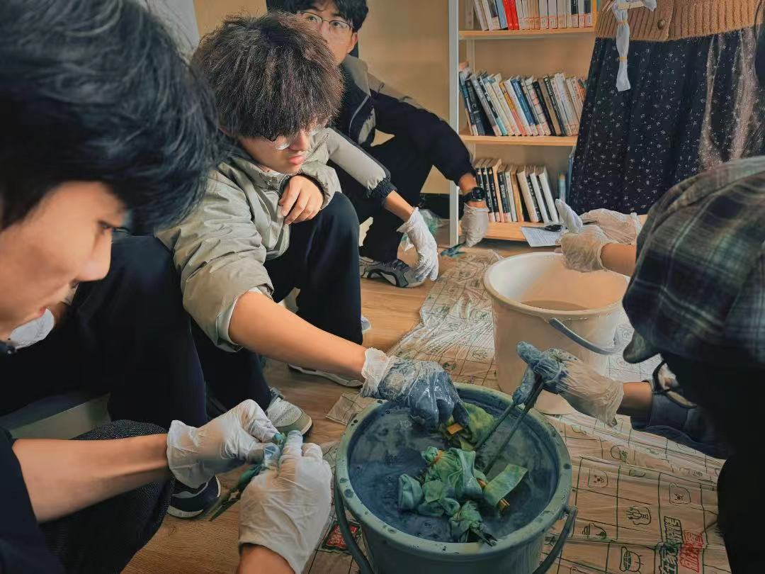 准备工作就绪,前期已发酵完成的植物染料散发出独特的自然气息。同学们将精心捆扎好的布料小心翼翼地投入染缸,新奇的操作瞬间点燃了现场的热情。大家围绕在染缸周围,兴奋地交流着各自的创意与捆扎手法,每一份布料都承载着不同的巧思与期待。活动期间,四位导师深入学生中间,与大家亲切互动,不仅解答疑问,更亲手示范,一同参与到这充满乐趣的创作实践中。