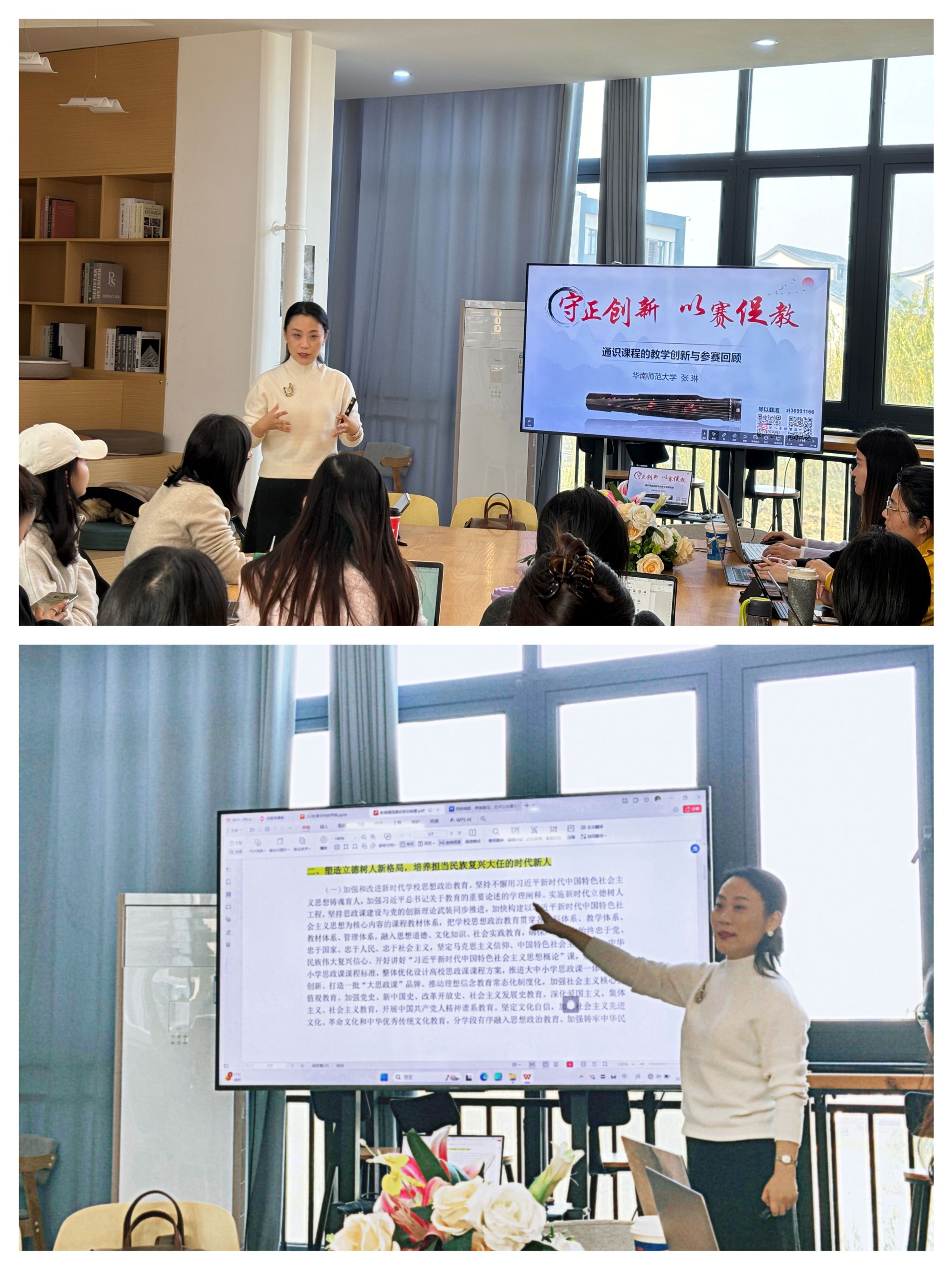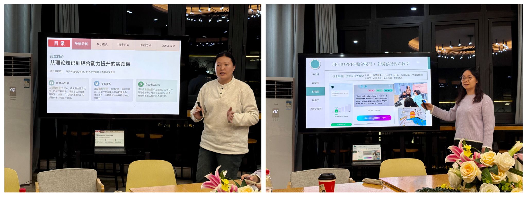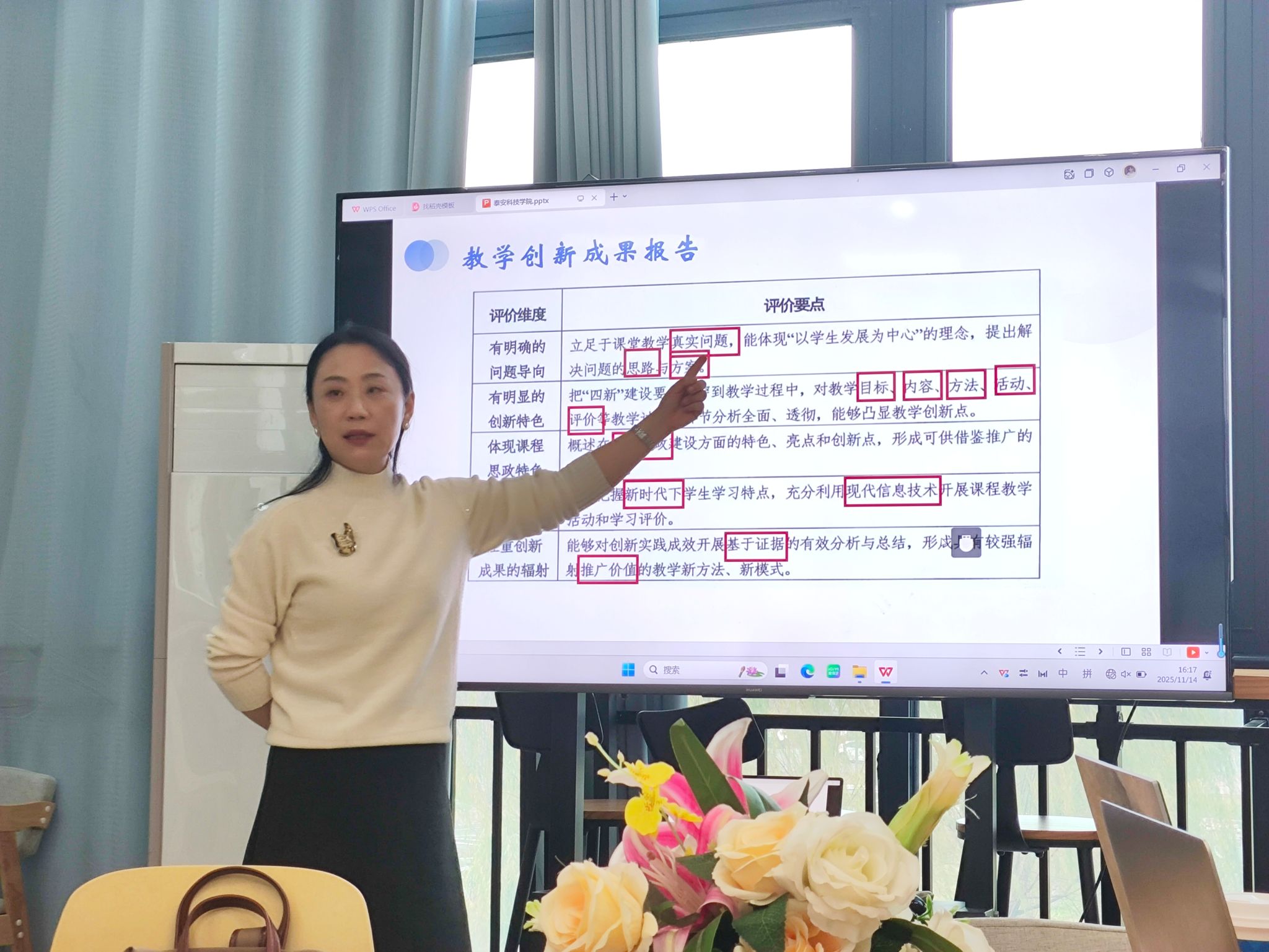 当晚,杨美丽老师、谭彭馨老师分别围绕《大学英语》、《当代国际冲突与治理》两门课程开展说课展示。武汉大学潘迎春教授、华南师范大学张琳教授结合说课内容进行了精准指导,在教学改革创新方向、实践路径等方面提出诸多具有指导意义的建设性意见。全天培训内容充实、干货满满,不仅有效破解了教师们在教创赛备赛及教学实践中的诸多困惑,更传递了跨学科协作、素养导向的教学创新理念,将为学院深化教学创新改革、提升人才培养质量注入强劲动力。