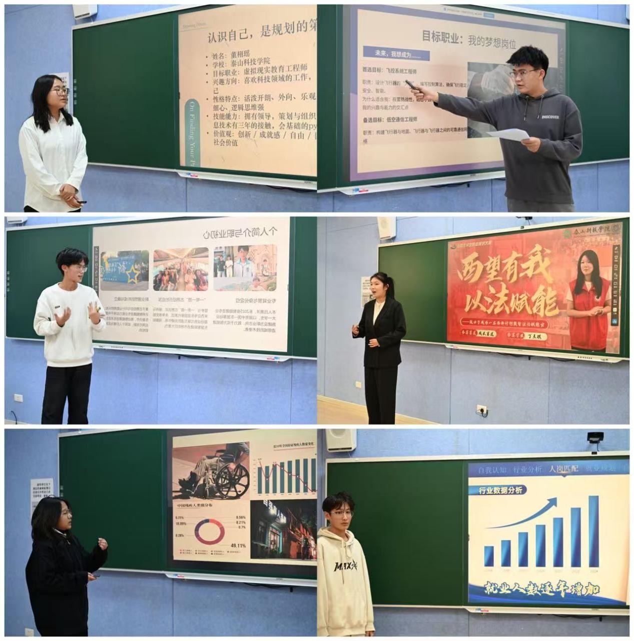 首位选手赵佩琪同学以《编织数字纽带,服务智慧城市》的答辩主题,拉开了职业规划展示的序幕。王小溪同学结合法律与心理学专业,在离婚冷静期政策背景下,为自己打造差异化职业路径,致力于修复婚姻关系、守护当事人权益。王盺婷同学围绕成为一名深耕日常用品赛道、兼具专业性与共情力的网络主播,系统阐述了自我认知、职业理解、优劣势应对、实施路径的全过程。代雨心同学讲述了一位“婚姻法治与心治双轨顾问”如何通过职业规划,运用“法律+心理”双轨模式,推动婚姻家庭辅导服务专业化发展。