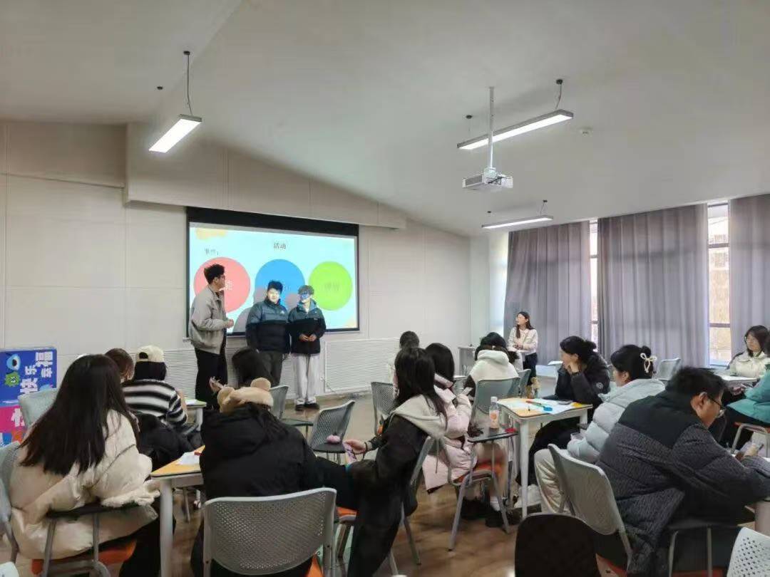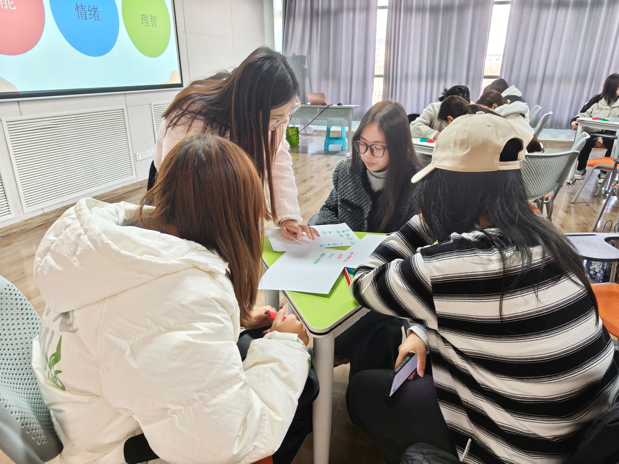 在整合与应用环节,活动聚焦实际问题解决。各小组领取白纸与彩笔,针对大学常见生活卡点,分别在红、蓝、绿三色圆圈内梳理对应本能反应、情绪状态与理智想法,再于纸背面共同提炼协调三方的行动建议。完成个人书写分析后,活动进入小组分享环节,组内成员围坐交流,依次讲述自身人生卡点及三重钥匙对应的状态梳理,在倾听与沟通中互换视角,以旁观者的身份深化对内在系统的认知,也收获同伴的经验参考,逐步摸索卡点应对思路。
