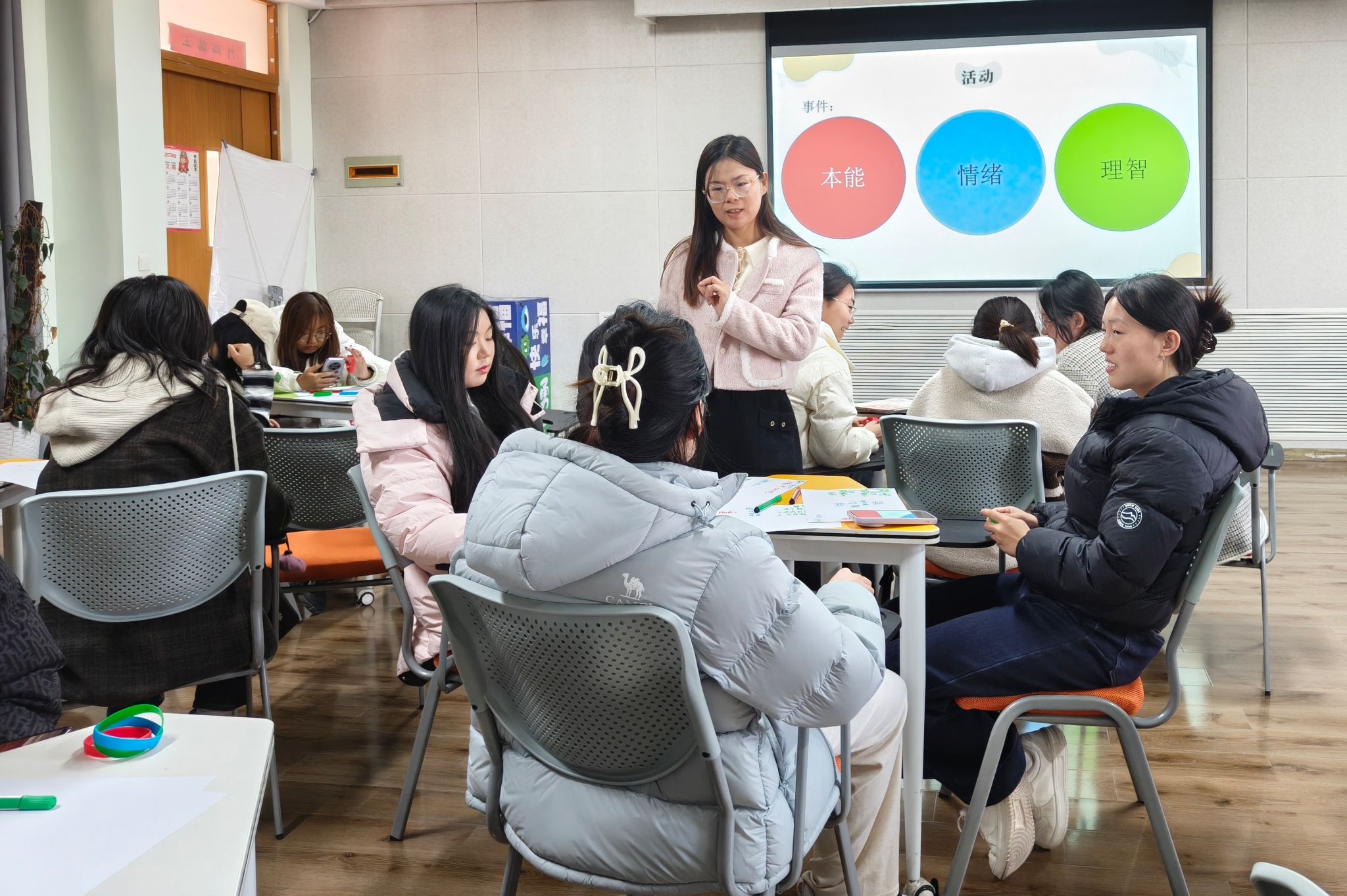 最后的环节聚焦实践体验,王老师通过呈现3个经典生活卡点案例,引导参与者按手环颜色开展角色扮演——红色手环者演绎“本能”角色,展现案例场景下的直观身体反应;蓝色手环者诠释“情绪”角色,传递对应感受与共鸣;绿色手环者扮演“理智”角色,输出分析规划与长远考量。学生们通过沉浸式角色扮演,更直观理解三者的运作关联,掌握协调三方、应对生活卡点的核心技巧。