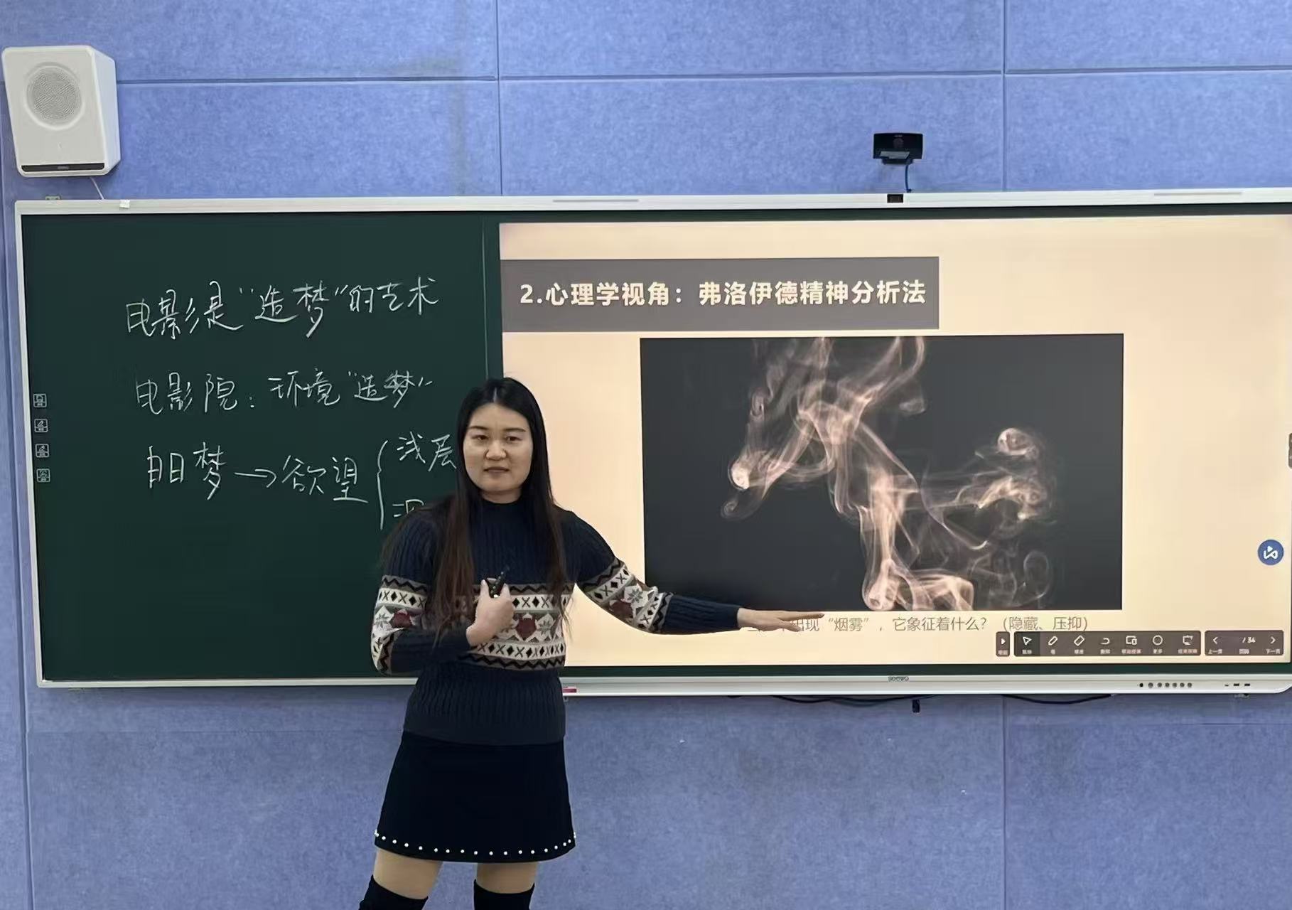 第一堂示范课是由李子一老师带来的《生活中的媒介艺术》专题分享。李老师用《你好,李焕英》的片段开头,深入分析了电影里的镜头语言、叙事和情感表达,生动地讲解了媒介艺术的“造梦逻辑”。在讲课过程中,她巧妙地结合了心理学中的共情理论和记忆唤醒等知识点,打破了学科界限,让媒介艺术和心理学结合,让抽象的艺术原理变得更容易理解。