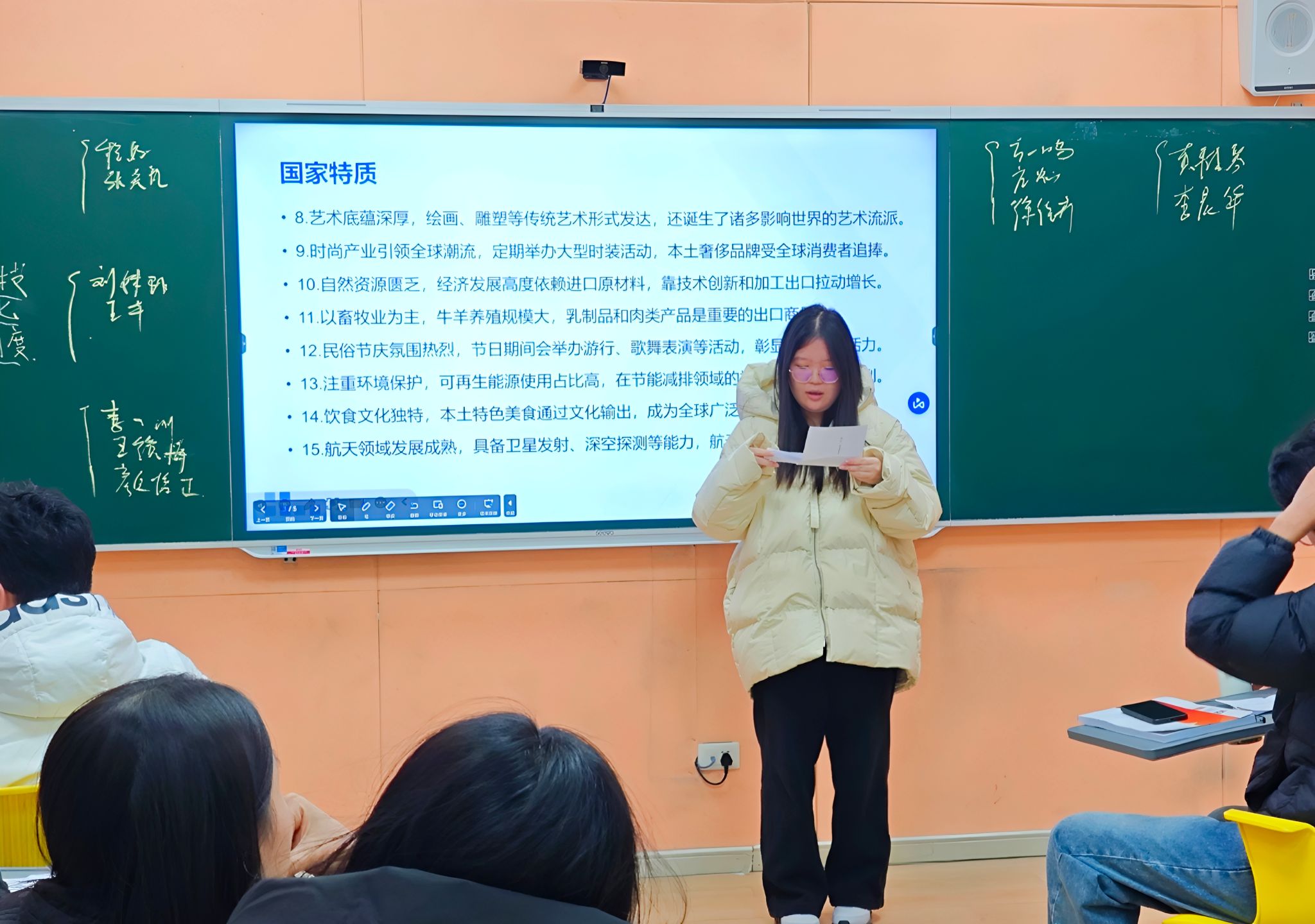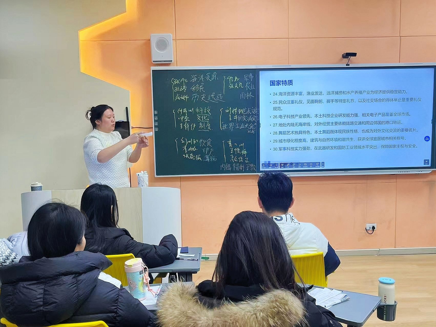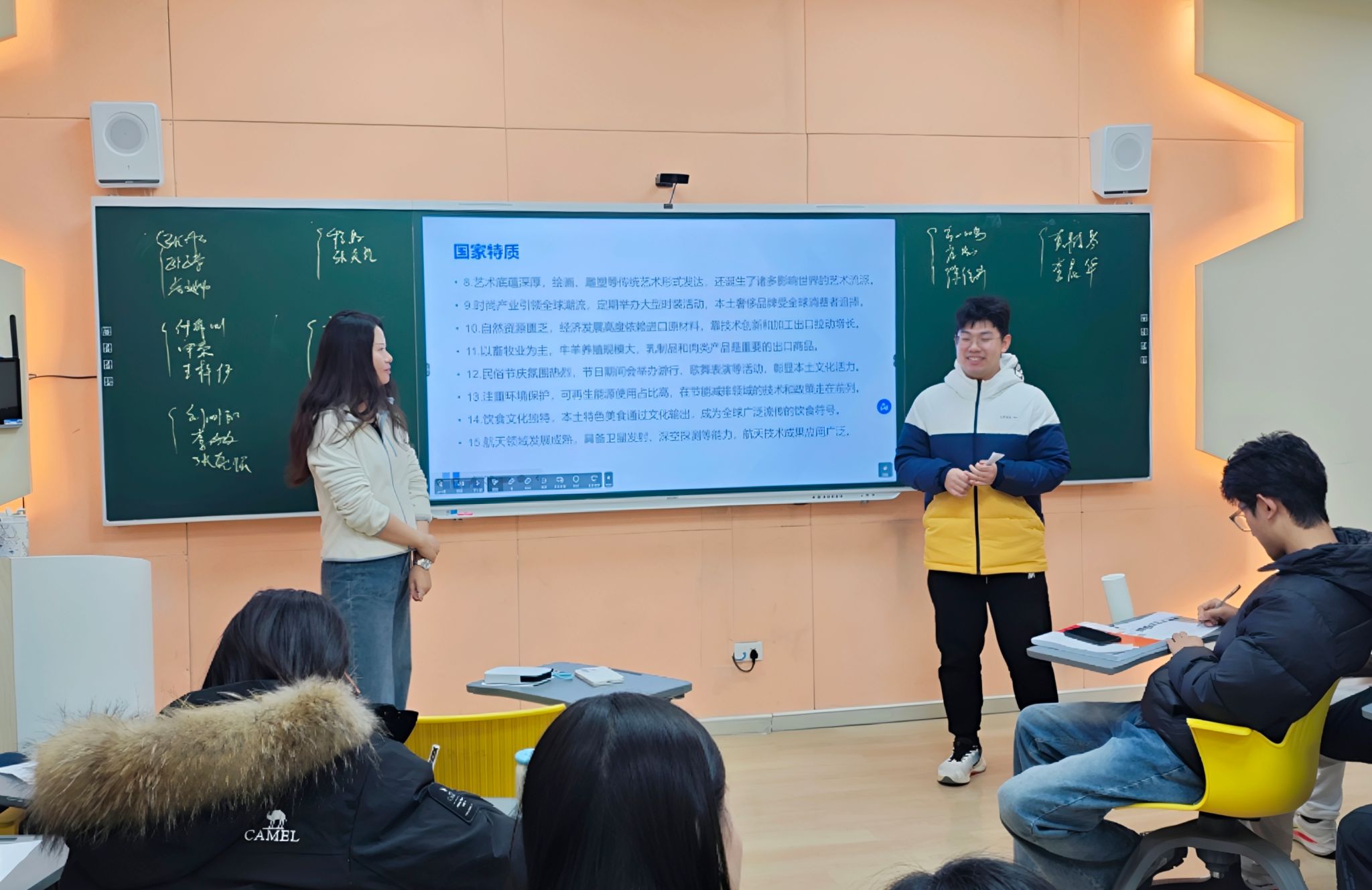 本次双师教学活动前期,谭彭馨老师与沙力老师经过多次研讨,结合两门课程的核心知识点与全球各国发展特质,精心筛选并梳理了三十个具有代表性的国家特点,涵盖文化传统、社会结构、政策导向、经济模式等多个维度。教学活动现场,老师将三十个国家特点制成抽签卡片,学生随机抽取后,需围绕所抽主题,同时结合组织行为学与公共外交的理论知识,分析该国家特点在组织管理实践与国际交流合作中的具体应用。