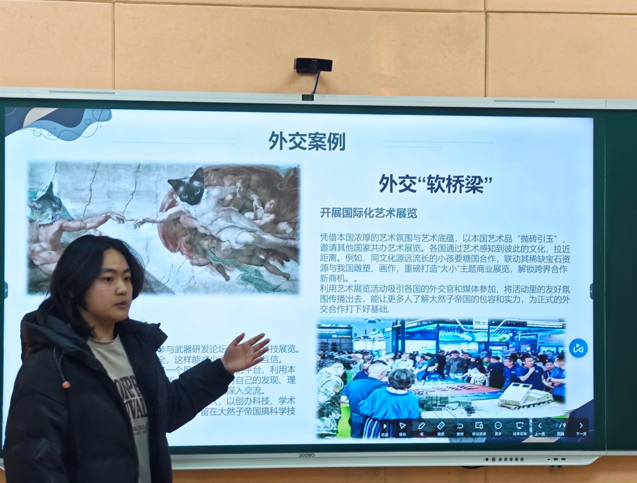 “我选择以金融巨头、民俗文化热烈、自然景观独特为切入点,量身打造公共外交方案。”范晓旭同学在展示中娓娓道来。她提出,以完善的金融体系为重要载体,搭建高效联动的国际合作平台;借力短视频平台矩阵与高质量纪录片创作,让文化传播更趋年轻化、大众化;通过与周边国家开展民俗文化展会,进一步增强两国友好公共外交互动。刘书瑞同学聚焦“奥勒利亚帝国”的工业实力雄厚、军事实力突出、权力高度集中三大特点,设计出“海外工业合作区”等务实实践路径,凸显了公共外交中的硬实力支撑。王辉同学则将目光投向农业与工商业并举的社会主义强国。这个国家坐拥源远流长的农耕文化,孕育出独树一帜的农商文明,在深耕农业发展的同时,更秉持工商业领域的技术引领与品质制胜之道,通过商业往来加强公共外交合作。课堂上创意涌动、精彩纷呈,除了上述构想,还有艺术与教育协同发展的文艺公共外交方案、以守护各国文物为己任的共同发展方案,以及在公共外交平台上强调友好往来的共同沟通方案,一个个特色鲜明的公共外交策略,勾勒出多样的发展图景。