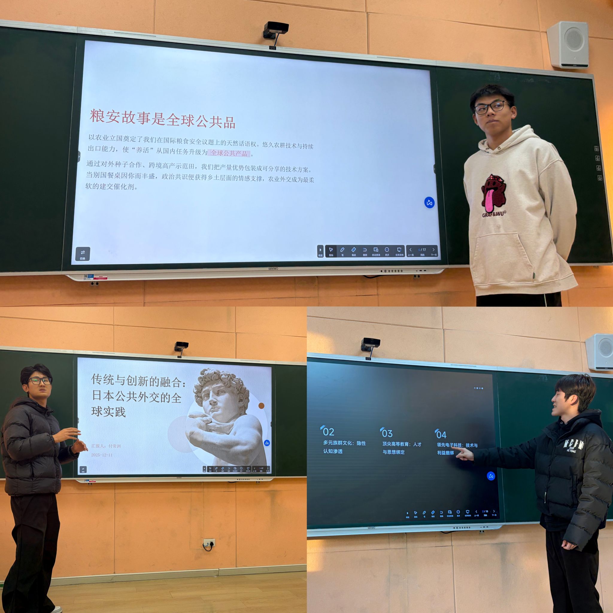课堂之上,同学们告别被动的知识接收者身份,化身为运筹帷幄的国家掌舵人,通过PPT成果展示、沉浸式情景模拟、针对性答辩互动等多元形式,将一个个兼具创意与深度的外交策略生动呈现。在情景模拟环节,面对“国际媒体突发提问”“跨国文化冲突调解”等预设挑战,同学们运用跨文化沟通技巧与公共外交谈判策略,灵活调整方案细节,展现出对复杂国际环境的敏锐洞察力和问题解决能力。答辩过程中,谭彭馨老师围绕方案的可行性、创新性及潜在影响进行提问,同学们也展开了激烈讨论,进一步推动学生从全球视野出发,优化策略设计,使公共外交方案更具现实指导意义。