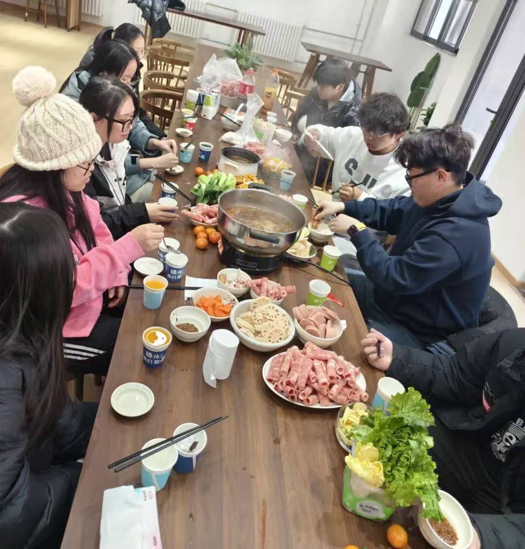 火锅咕嘟咕嘟地冒着热气,鲜香的味道弥漫开来,师生共宴环节正式开启。大家围坐一桌,一边享受热气腾腾的火锅,一边分享本学期的成长与收获。大一新生宋泽爽向大家分享了作为工坊主理人向外国友人介绍中国传统文化时的趣味故事;张文婷同学向大家讲述了在韩国交换时的难忘瞬间和感受到的文化差异;其他学长学姐也解答了学弟学妹的相关困惑,温暖的氛围在火锅的热气中不断升温。