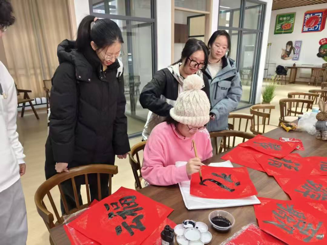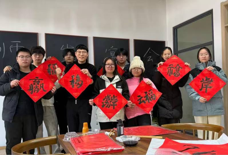 作为新年家宴的压轴环节,写福字、书春联活动,为这场温情之约增添了浓浓的年味与书香。刘炎老师耐心示范书写的技巧,为每一位同学送上新年祝福,同学们也迫不及待上手尝试,写下新年的美好期望。一幅幅寓意吉祥的福字跃然纸上,一副副饱含期许的春联工整雅致。既是刘老师对新年的美好祈愿,也是对同学们学业有成、顺遂无忧的深情祝福。