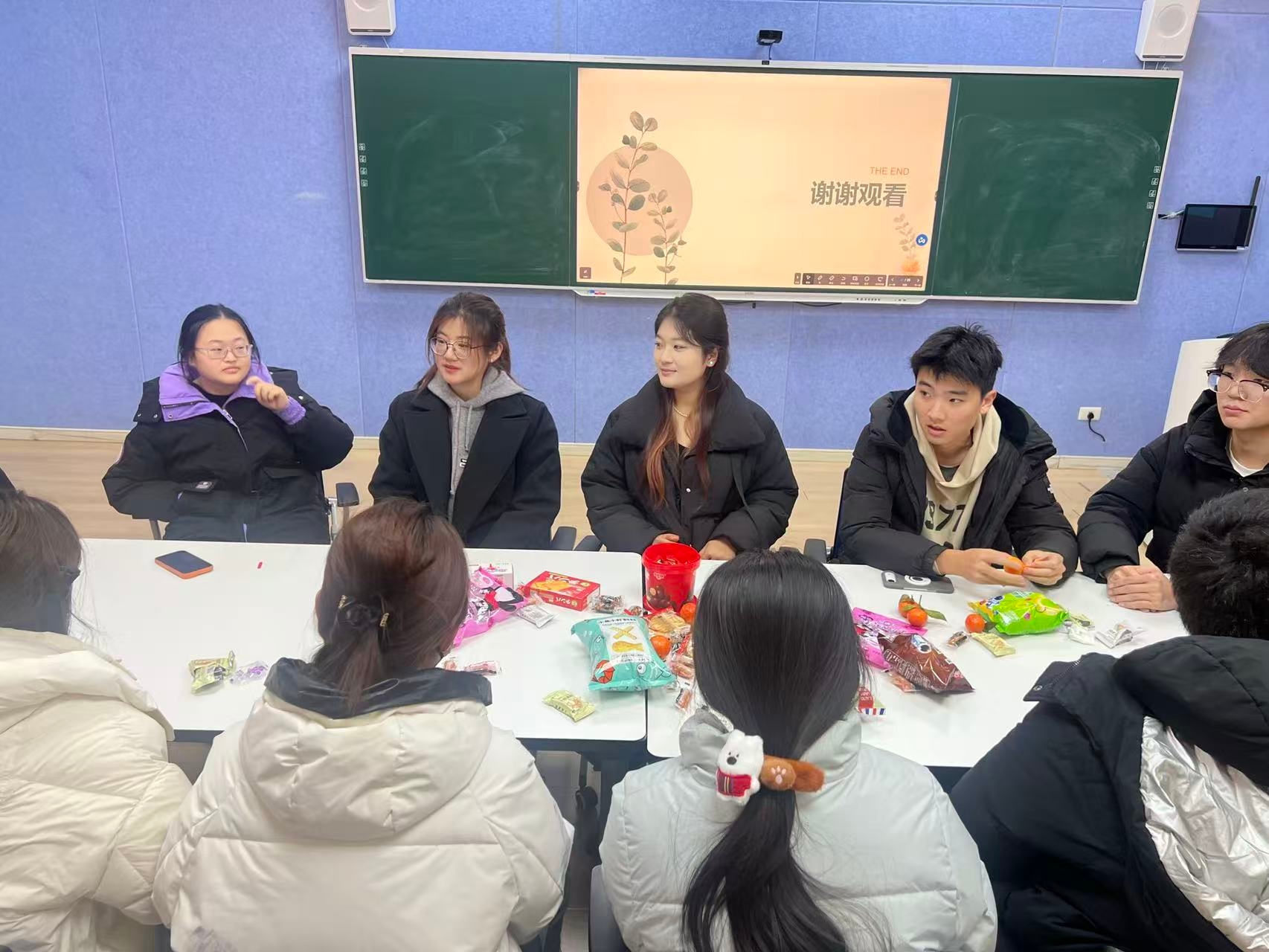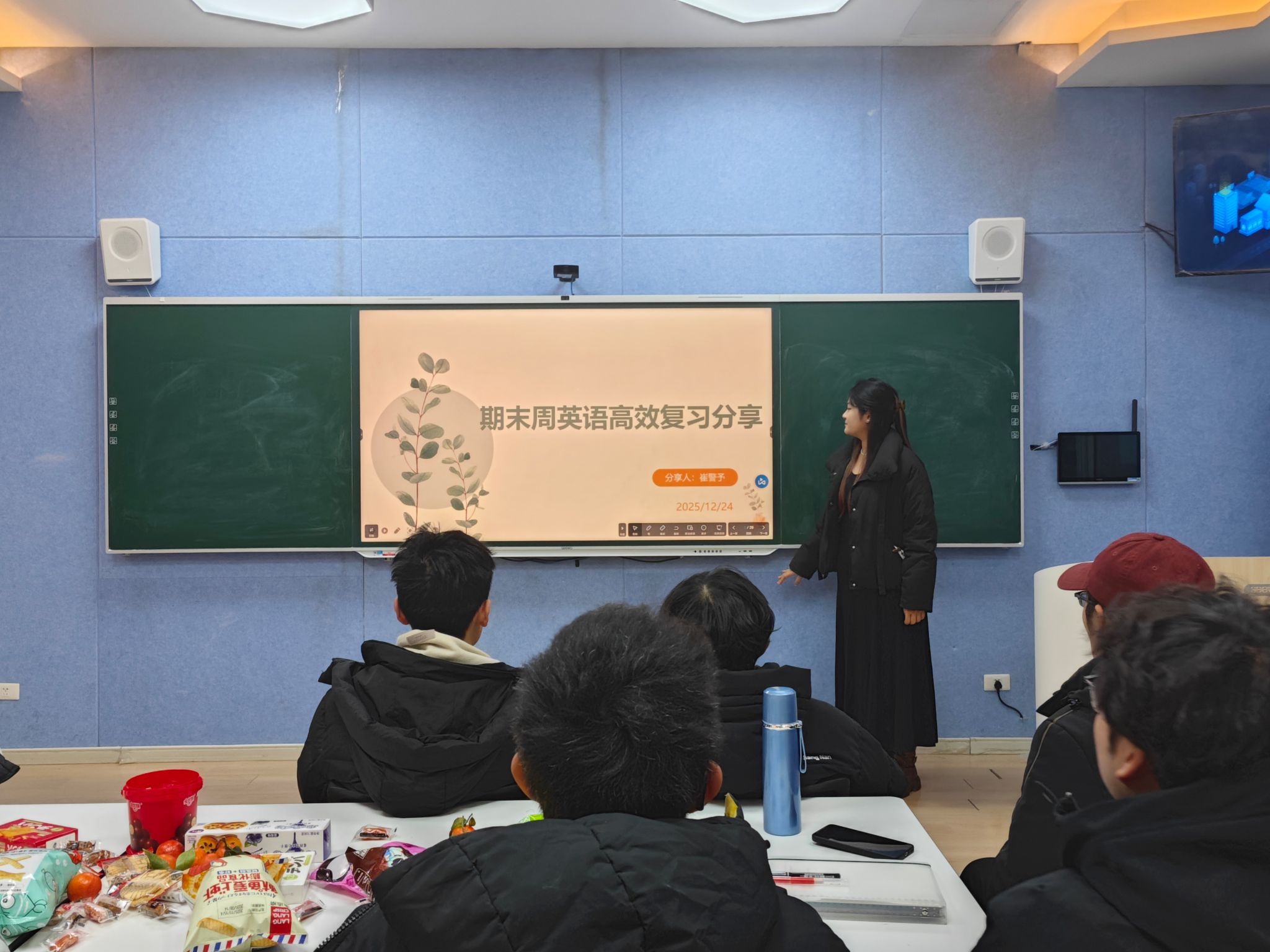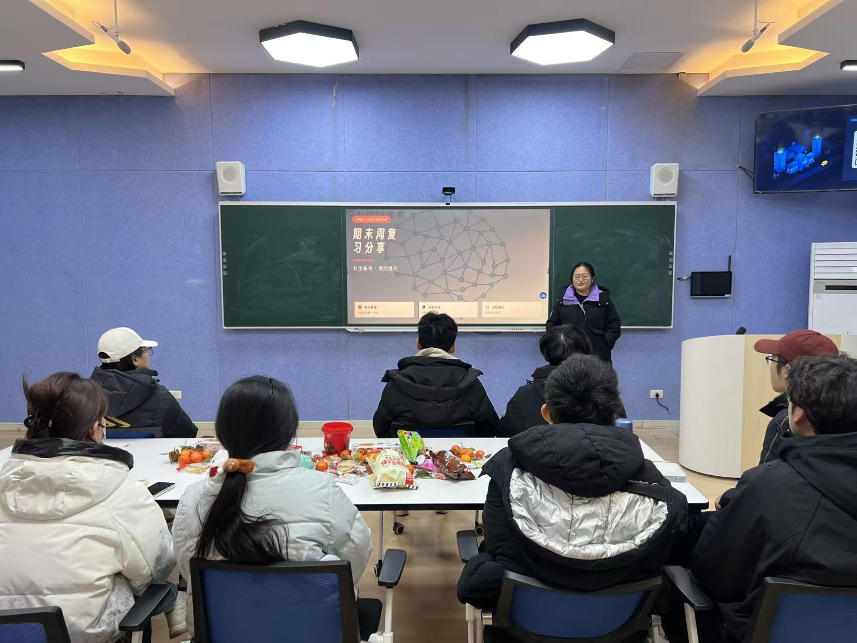 在互动交流环节,同学们围绕高数公式记忆、英语阅读时间分配、作文构思等问题踊跃提问,两位学姐结合自身经历耐心解答,现场气氛轻松而热烈。活动期间,李晓冉老师和杨玉婷老师还为同学们准备了贴心的小零食,在紧张的期末周中为大家送上一份温暖关怀。