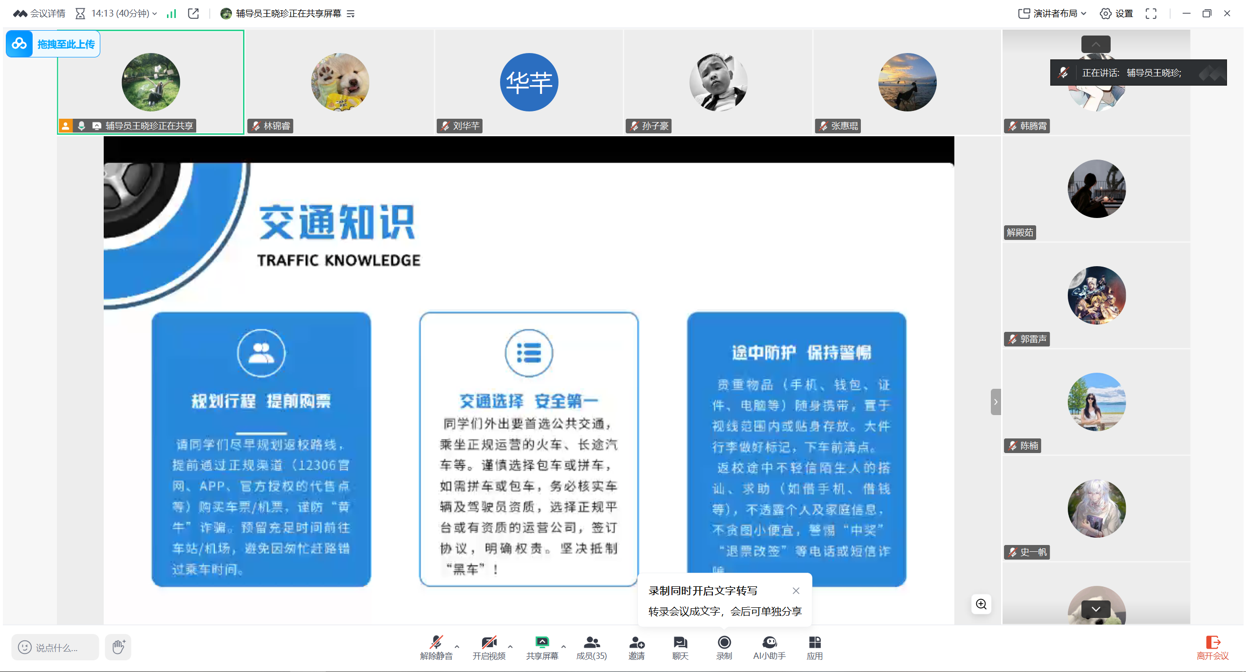 2023级辅导员王晓珍老师将安全教育的重心放在“出行安全”与“消防安全”两大维度。王老师详尽解读了交通法规要点,特别提醒学生返校应选择正规交通工具、拒绝乘坐超载或非法运营车辆、自驾务必遵守交规并杜绝疲劳驾驶,并强调行程规划、信息报备、财物保管及紧急联系人设置等实用细节。王老师还提醒同学们返校后注意天气变化、及时调整作息,加强身体锻炼,如有不适及时报告与就医,以积极饱满的状态迎接新学期的学习与生活。