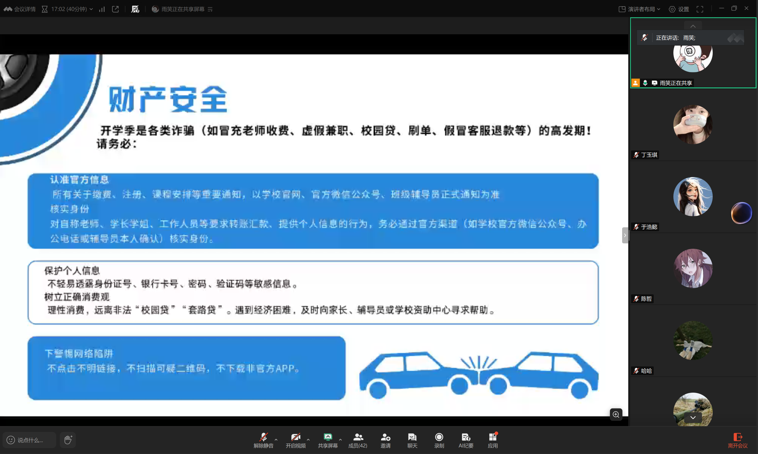 2022级辅导员朱志浩老师重点关注返校途中的人身与财物安全。朱老师提醒同学们务必选择正规交通工具,合理安排行程,避免夜间独自出行,并注意保管好随身物品,防范盗窃和诈骗。朱老师结合近期高校真实案例,深入剖析“刷单返利”“冒充客服”、“虚假购物服务”“AI换脸诈骗”“实习陷阱”等多种诈骗手段的核心逻辑与话术陷阱。朱老师强调,务必保持“天上不会掉馅饼”的清醒认知,不轻信、不转账、不透露,牢牢守护个人“钱袋子”。朱老师还特别强调,返校后应及时整理宿舍,检查电器线路,杜绝消防安全隐患,共同维护整洁、安全的居住环境。