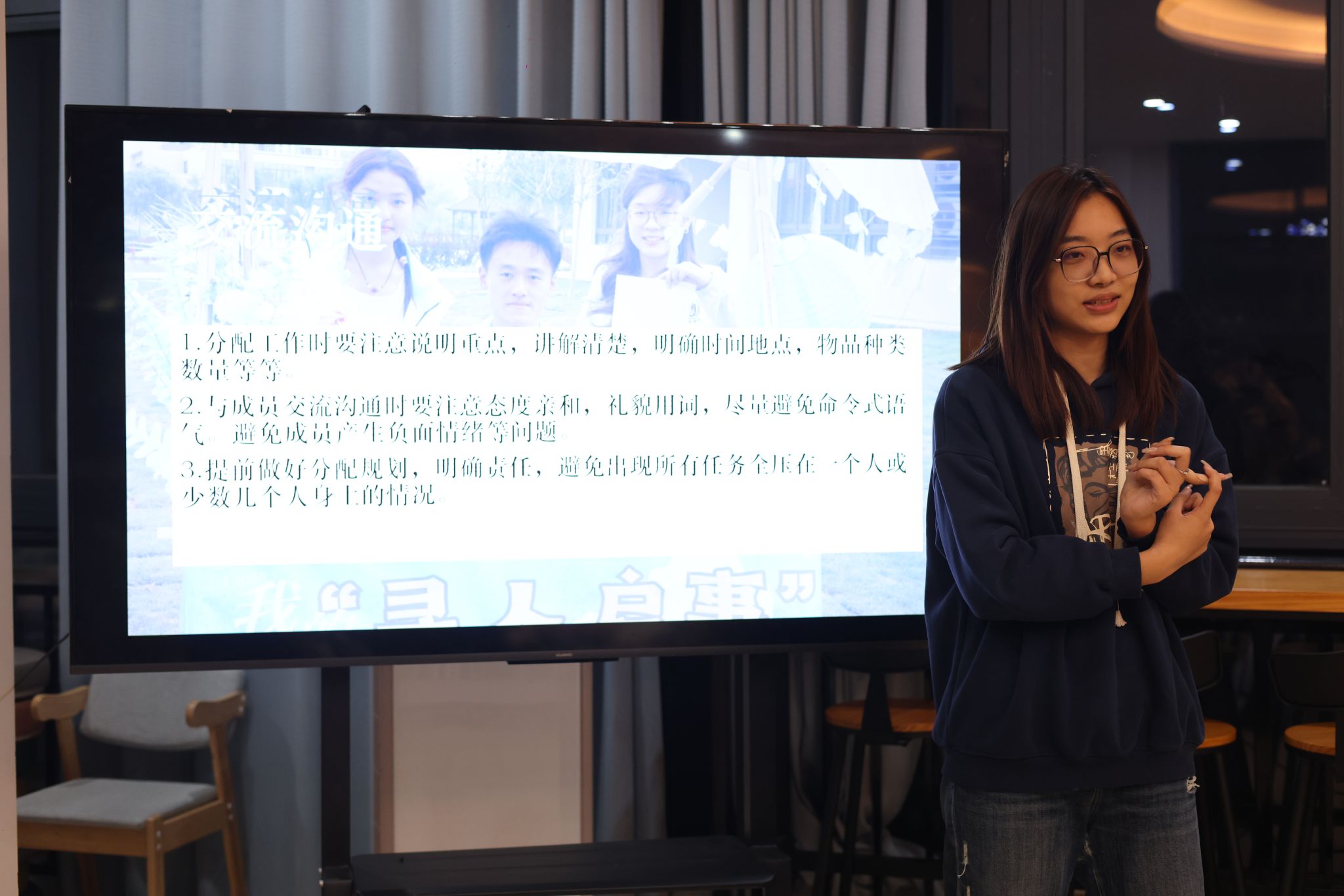 组织部副部长赵子晗同学则从“工作细节把控与团队凝聚力建设”出发,为参训干部提供了全新的工作思路。在完满团支部对接工作上,她强调“细致”是核心原则,避免因细节疏漏影响工作推进。对于指尖派活动策划,她结合过往案例,明确策划案及具体要求。