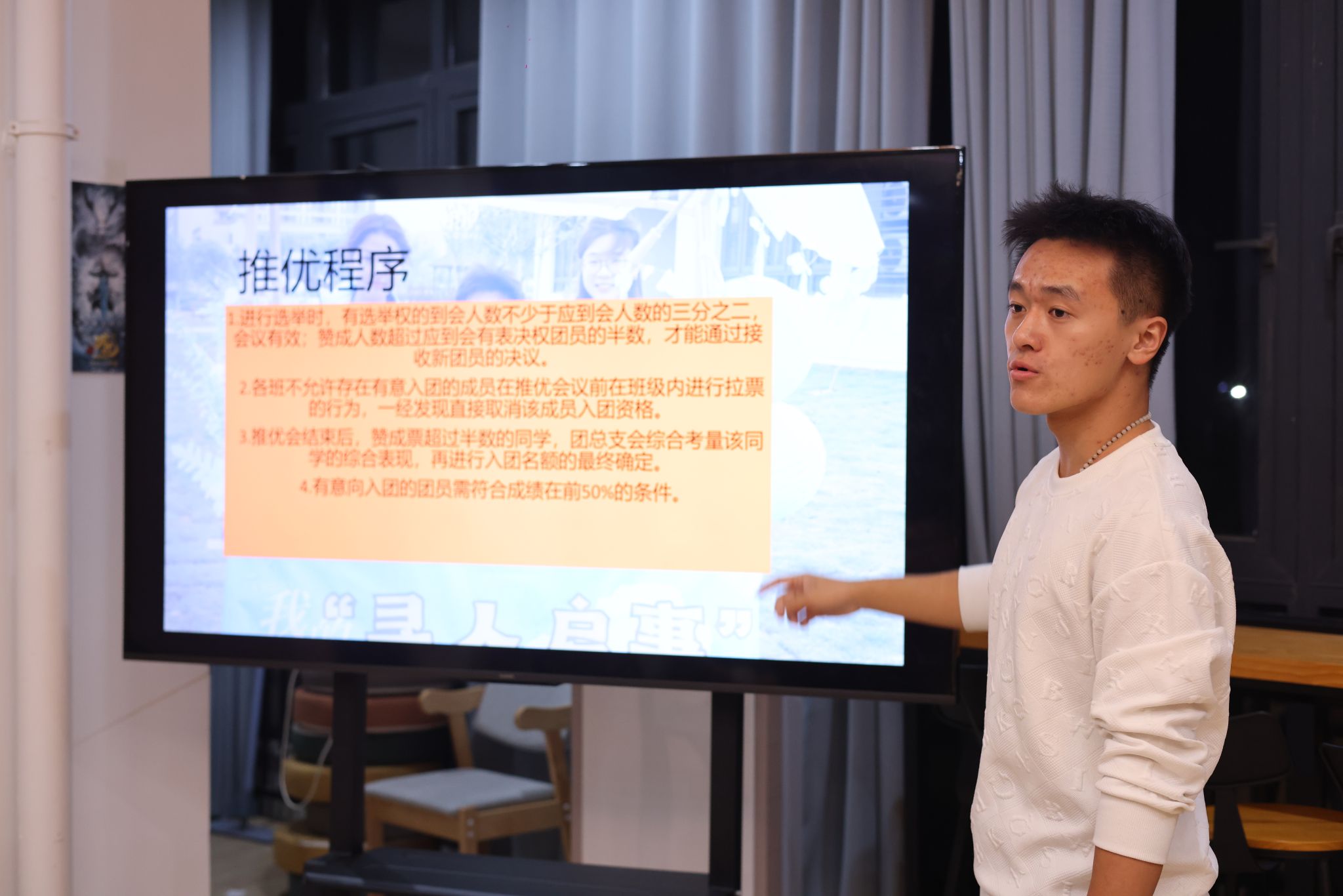 随后,2024级学长吴凯同学聚焦团务工作中的重点环节,带来极具实操性的经验分享。他首先详细梳理了推优流程,他把每个步骤都结合具体案例进行拆解,让参训干部清晰掌握推优工作的逻辑与规范。针对“智慧团建”系统团课录入这一高频实操任务,吴凯学长更是采取“步骤讲解+现场演示”的方式,手把手指导大家操作,切实提升了大家的团务工作实操能力。