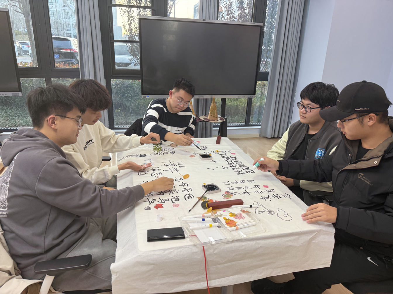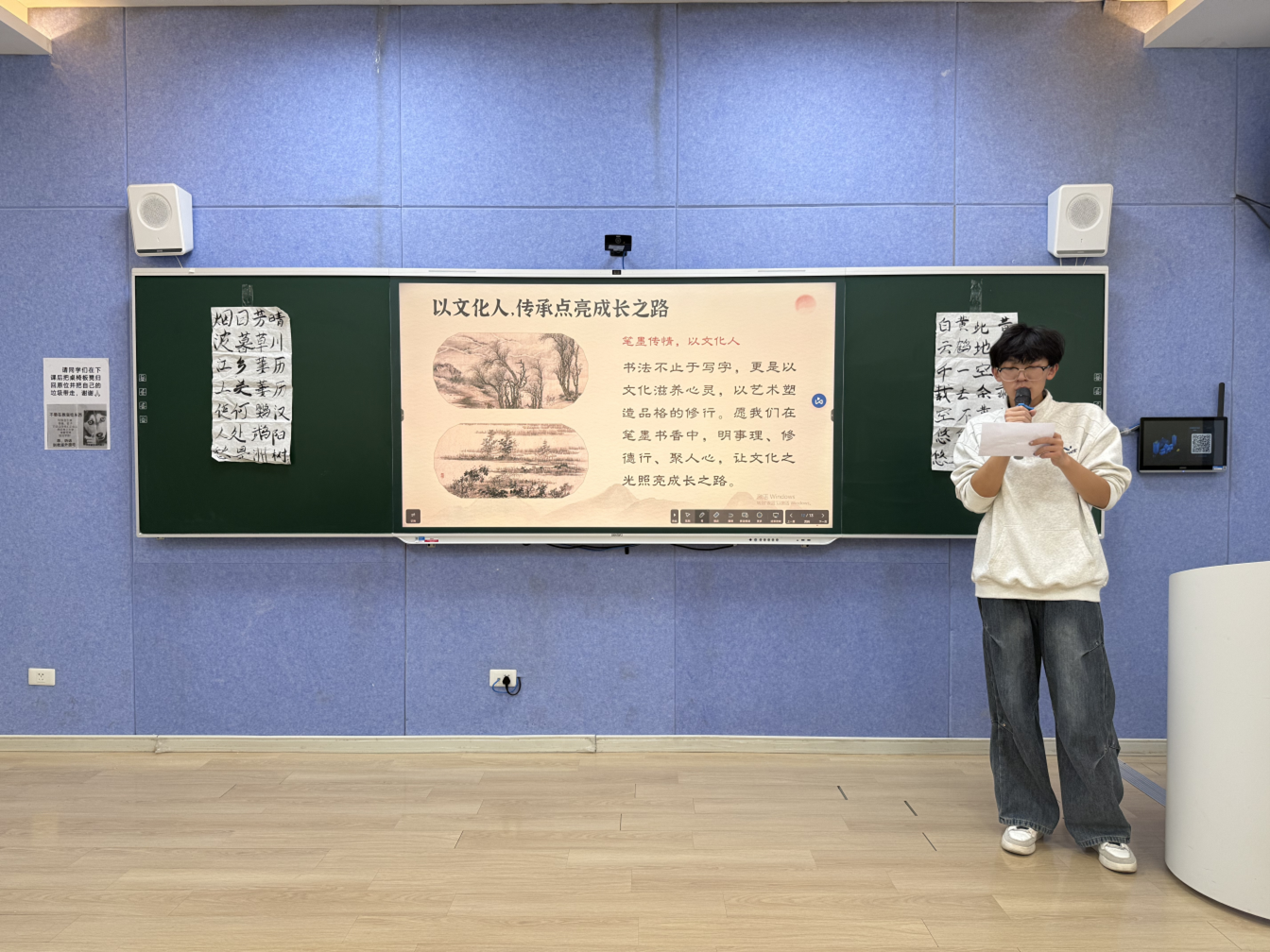 书法爱好者与新手同学的“师徒结对”环节,成为现场最暖的风景线。“写‘笃’字的竖画要稳,像扎根的大树,慢慢沉力”,曹圣寒同学握着沈瑞晨同学的笔轻声指导;笔尖在宣纸上渐渐舒展,墨痕里不仅藏着书法技艺的传承,更盛着同窗间的温情。班长张楚晨计划将这些“师徒合作”的作品打造成班级文化墙,让这份墨香里的温度,成为班级“传艺又传情”的专属印记。