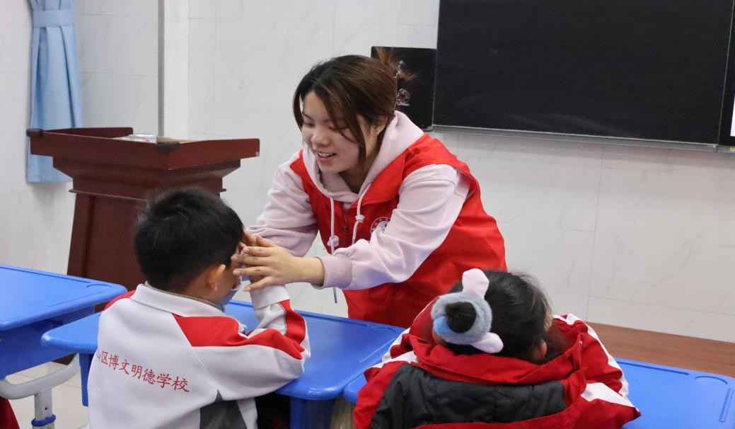 眼保健操音乐缓缓响起,志愿者们分组来到小朋友身边,手把手指导穴位按压:“攒竹穴在眉毛起点的小凹陷处,轻轻按揉就好”“按压睛明穴时不要太用力哦”。他们仔细纠正不规范动作,确保每个孩子都能掌握要领。